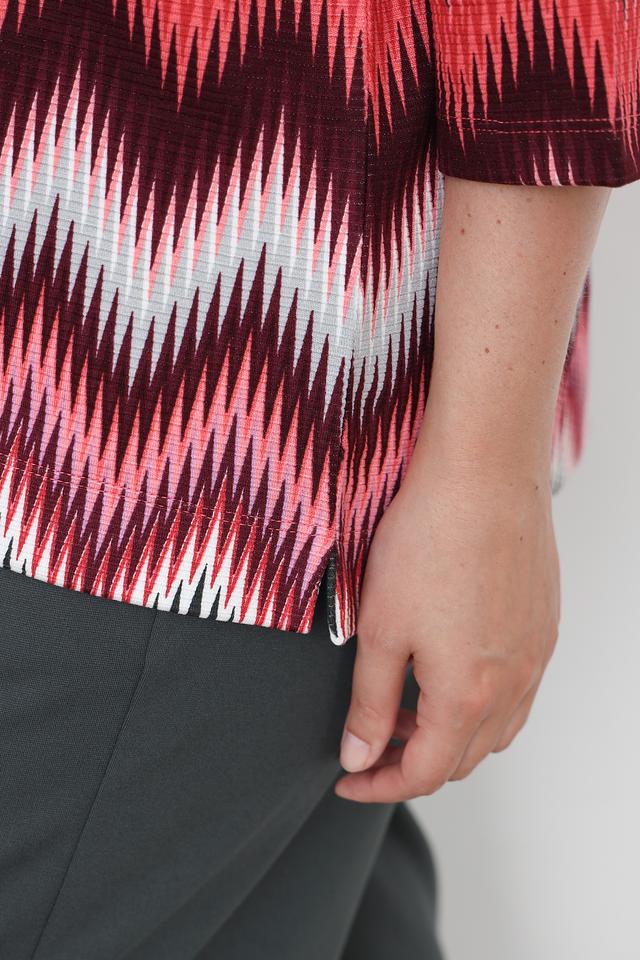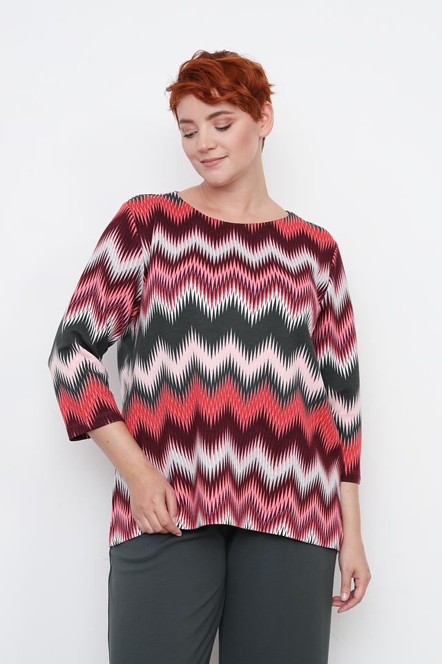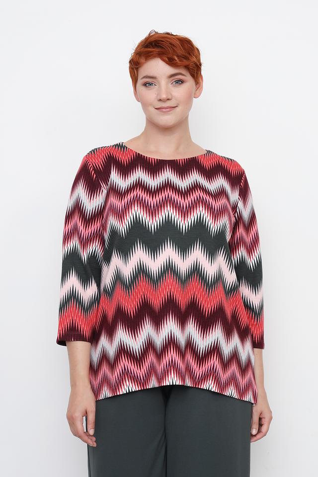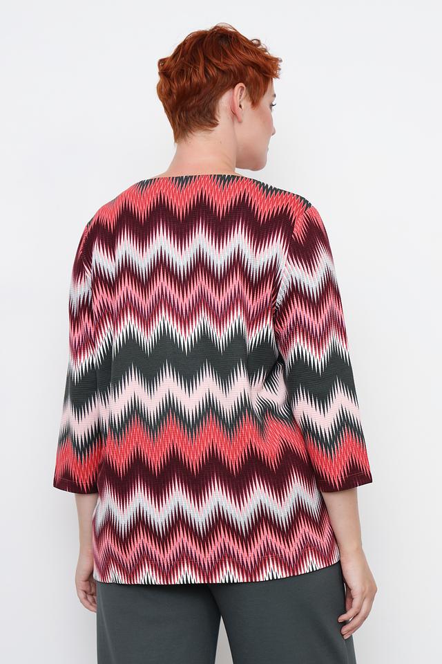 Пуловер имеет яркий, запоминающийся узор в бордовых, розовых и серых тонах, который придаёт ему оригинальность. Круглый вырез горловины и рукав 3/4 делают его универсальным для различных образов.