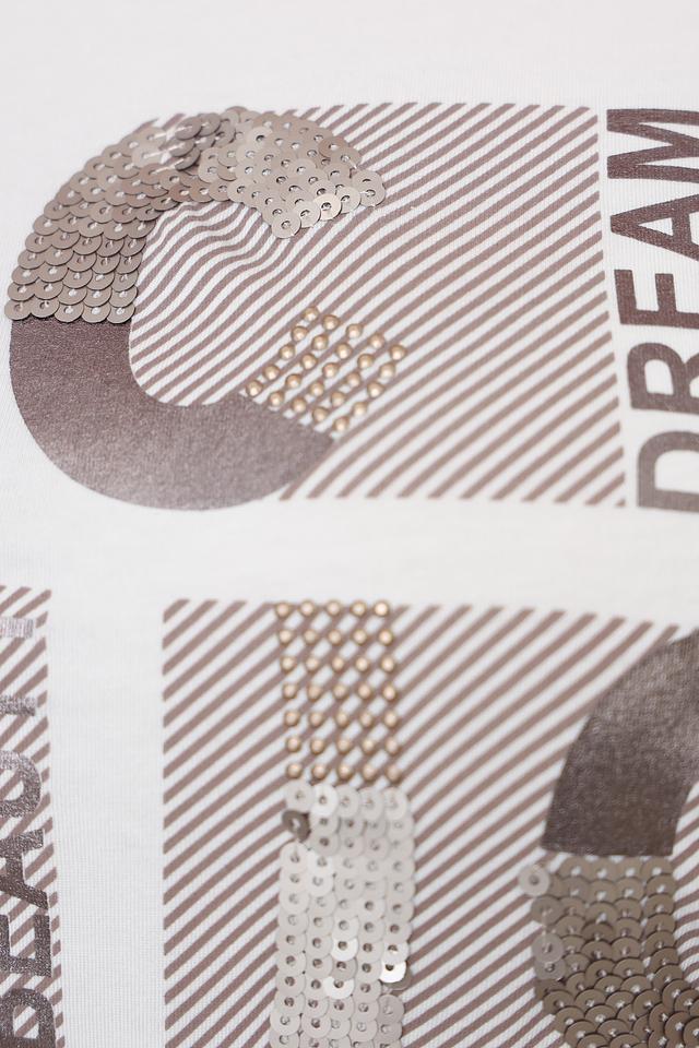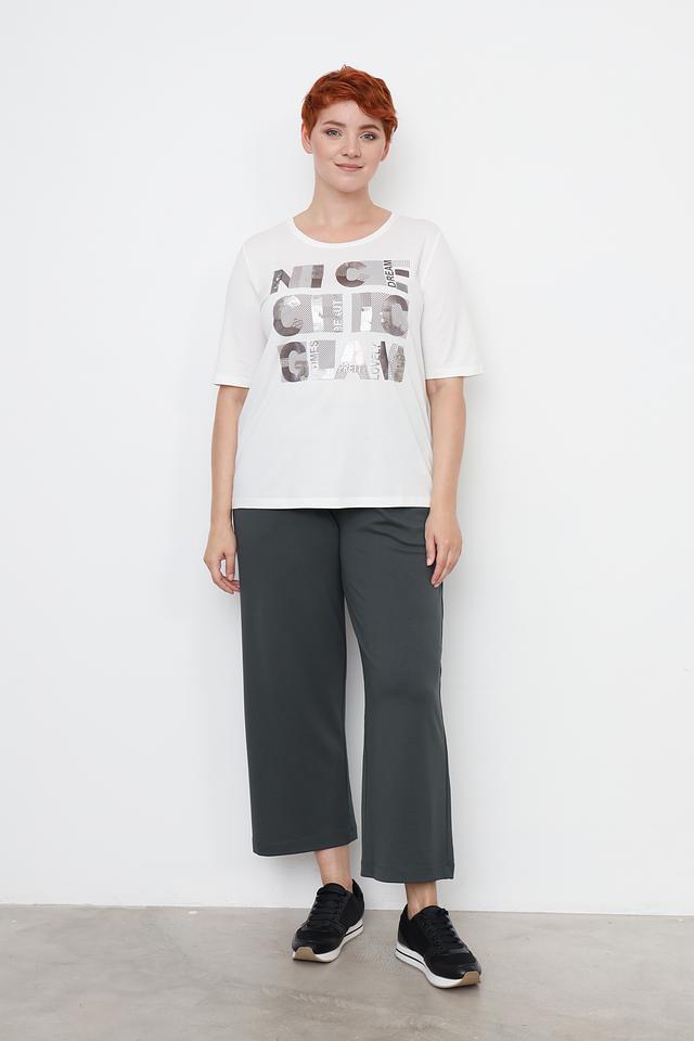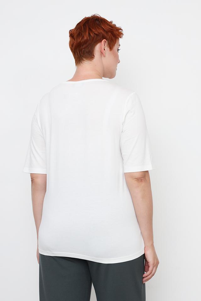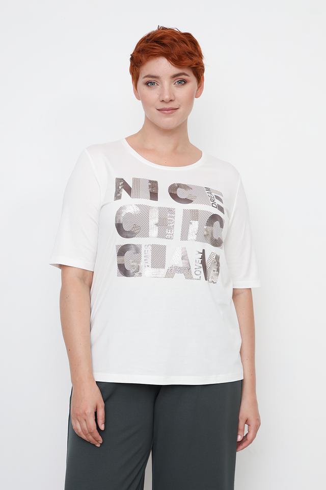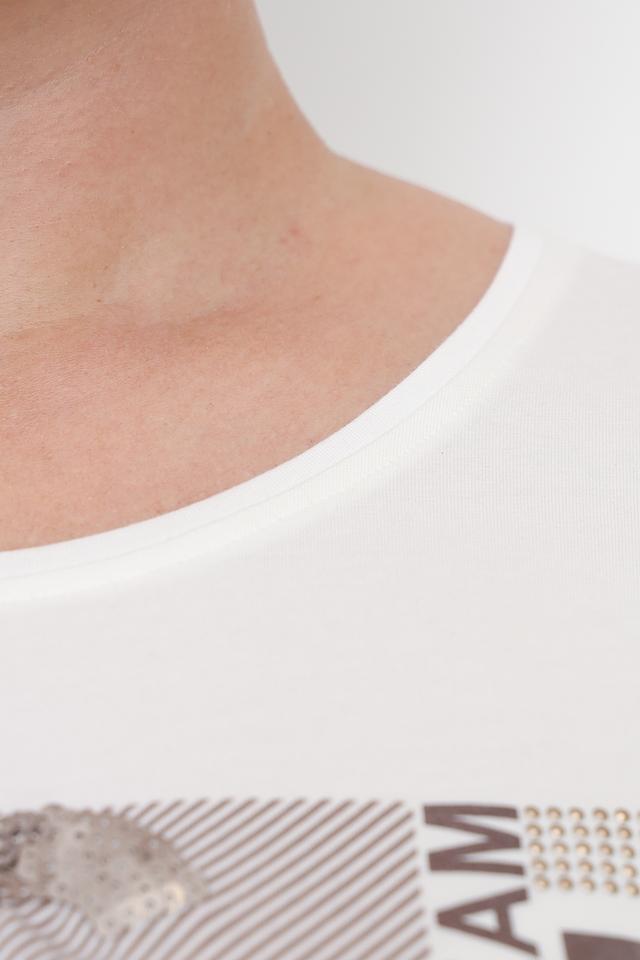 Белая футболка Via Appia DUE женского кроя с оригинальным принтом. Изготовлена из мягкого и приятного к телу сочетания хлопка, модала и эластана, обеспечивающего комфорт при носке. Состав: хлопок 47%, модал 47%, эластан 6%