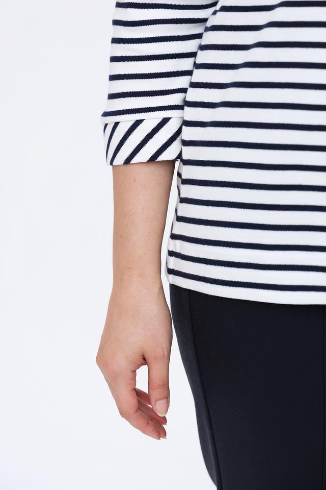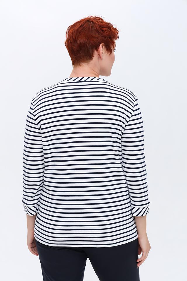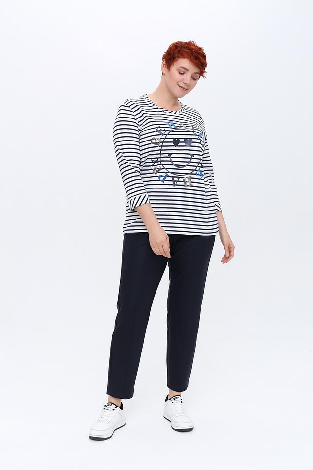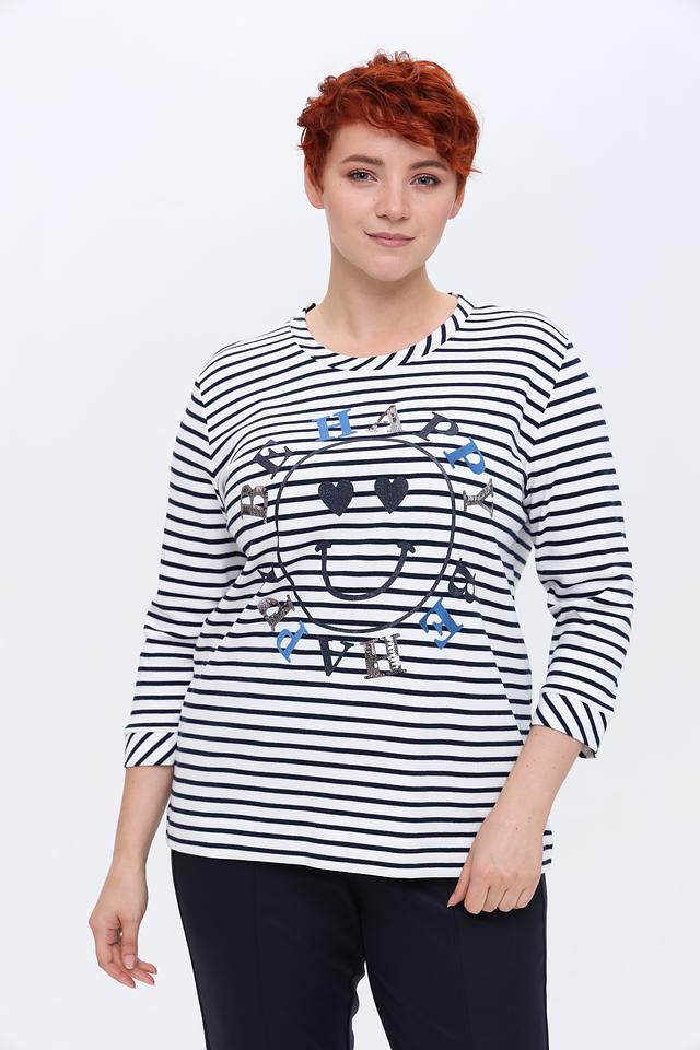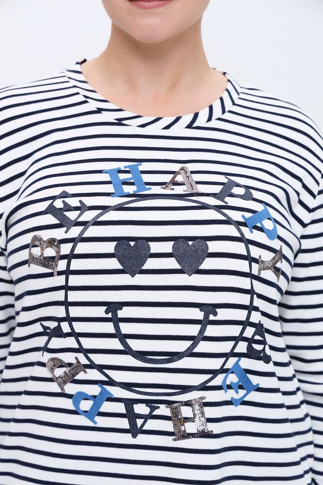 Лонгслив выполнен в классическую бело-синюю полоску, которая всегда актуальна и легко сочетается с другими элементами одежды. Главной особенностью модели является яркий принт в виде смайлика, украшенный аппликациями и стразами, что придает образу игривость и индивидуальность.