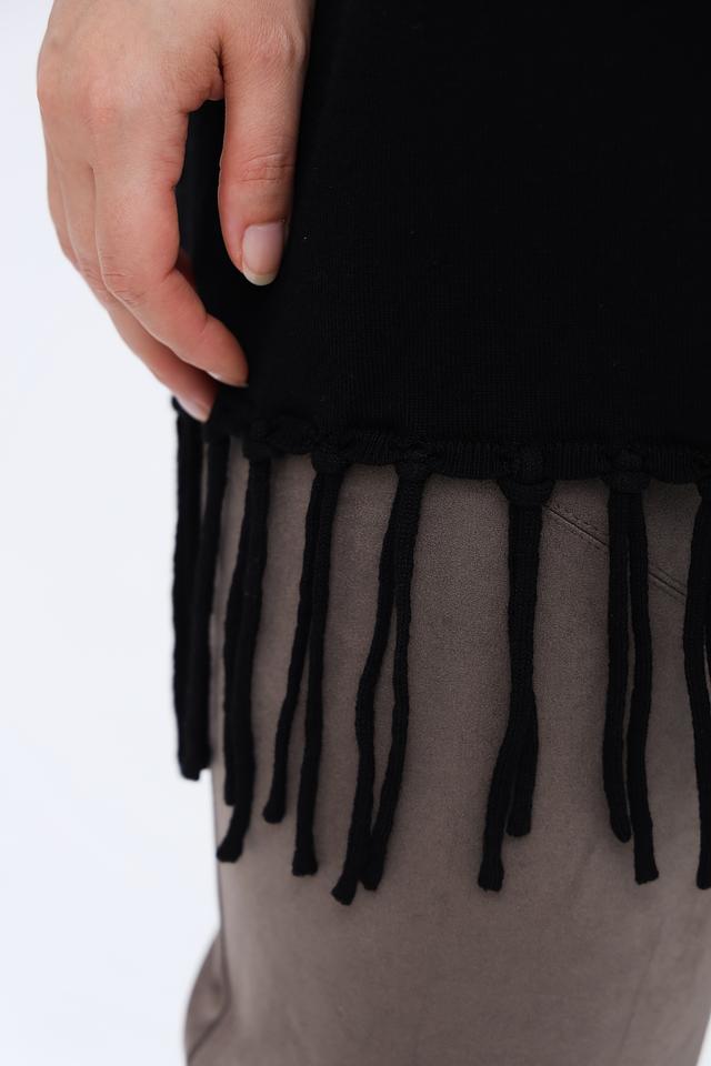 Жилет имеет прямой крой, который обеспечивает комфортную посадку по фигуре. Особенностью модели является бахрома по нижнему краю, добавляющая образу лёгкость и оригинальность.