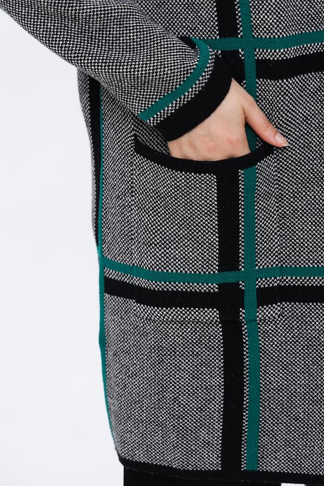 Этот жакет от Via Appia станет отличным дополнением к вашему гардеробу. Модель выполнена в сером цвете с выразительным геометрическим узором в клетку, сочетающим в себе чёрный и зелёный цвета.