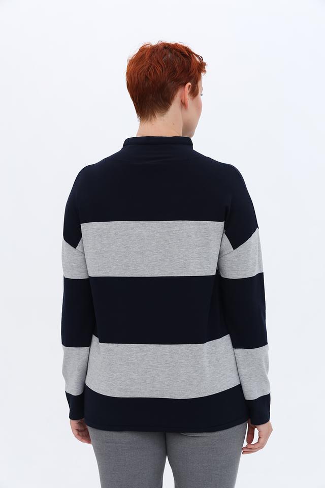 Дизайн пуловера выполнен в сочетании темно-синего и серого цветов, с крупным графичным принтом, привлекающим внимание. Капюшон добавляет практичности и создает более расслабленный образ.