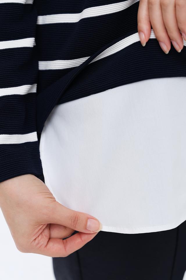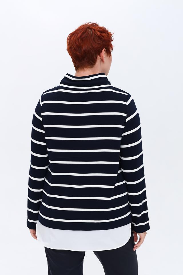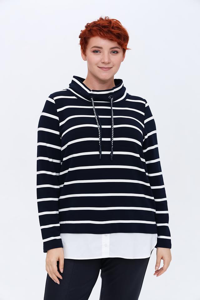 Женский пуловер Via Appia синего цвета с белыми полосами – стильная и комфортная модель с высоким воротником и шнурками. Изготовлен из мягкой вискозы с добавлением полиэстера и эластана для удобства в носке. Состав: вискоза 88%, полиэстер 10%, эластан 2%