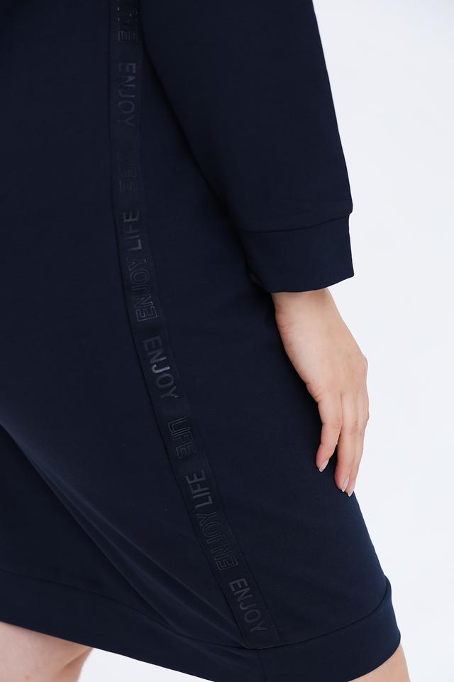 Платье оснащено удобными карманами, которые позволяют хранить необходимые мелочи. Изготовлено из мягкого трикотажа, состоящего из 71% хлопка, 24% полиэстера и 5% эластана, что обеспечивает приятные тактильные ощущения и хорошую износостойкость.