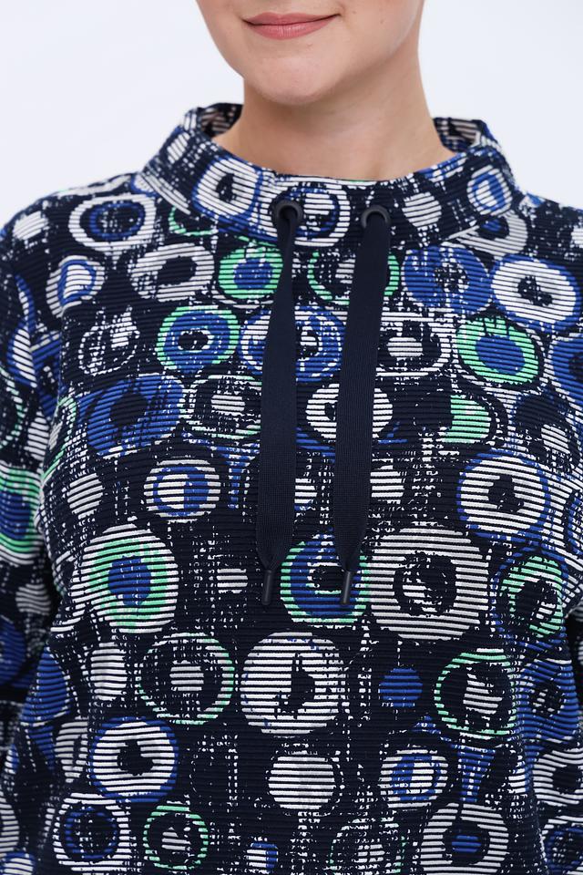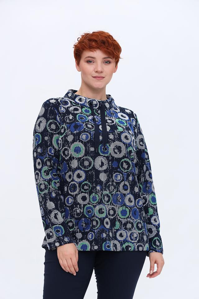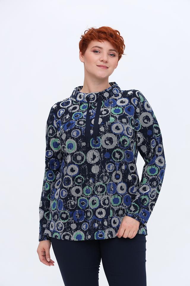Лонгслив имеет оригинальный принт, выполненный в синих, зеленых и белых тонах, что делает его ярким и запоминающимся. Модель с длинными рукавами и небольшим вырезом горловины, дополненным завязками.