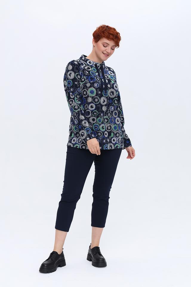 Женский лонгслив Via Appia синего цвета с оригинальным геометрическим принтом. Изготовлен из мягкой вискозы с добавлением полиэстера и эластана для комфорта и хорошей посадки. Состав: вискоза 76%, полиэстер 20%, эластан 4%