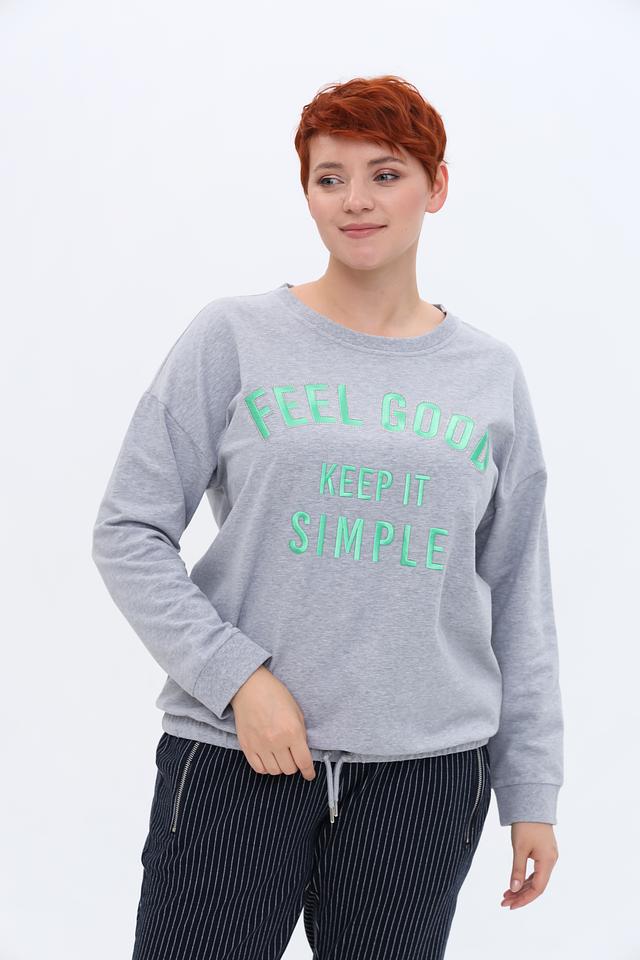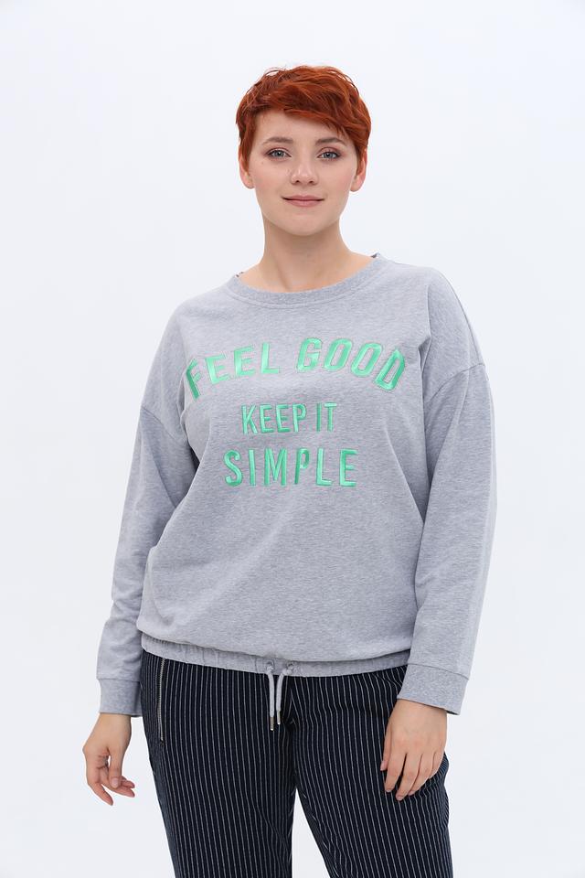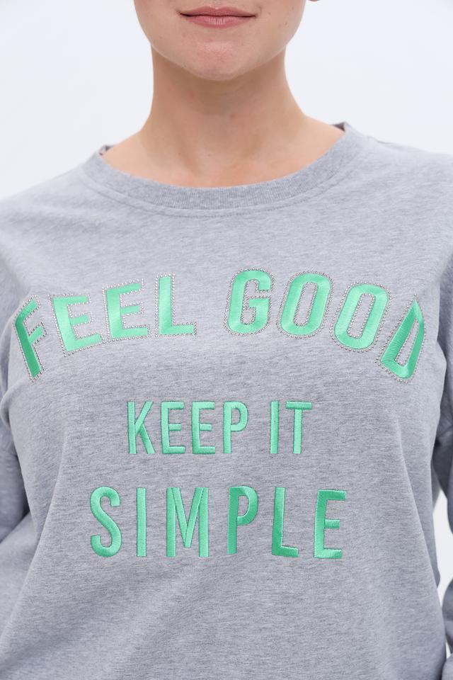 Модель имеет прямой крой и круглый вырез горловины. На передней части пуловера расположен яркий принт с надписью "FEEL GOOD KEEP IT SIMPLE", выполненный в мятном цвете, что добавляет образу свежести и оригинальности.