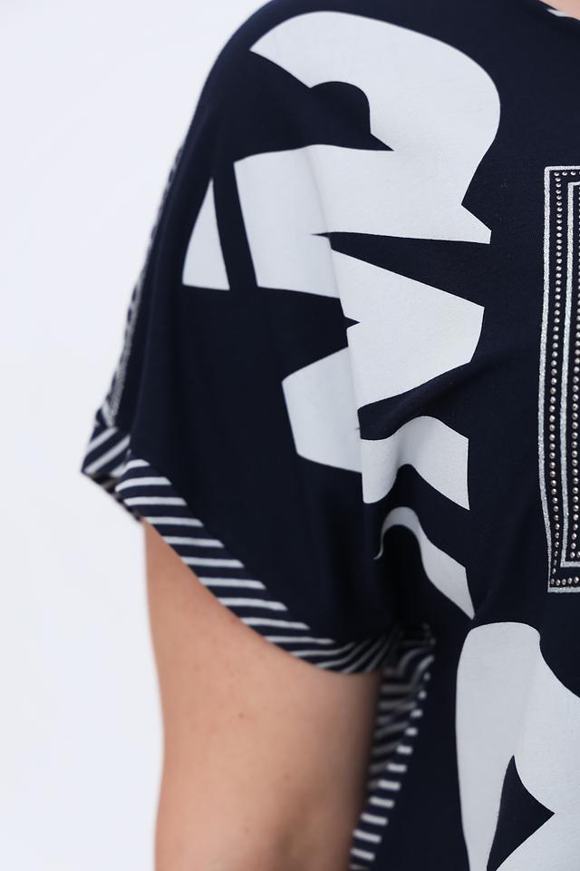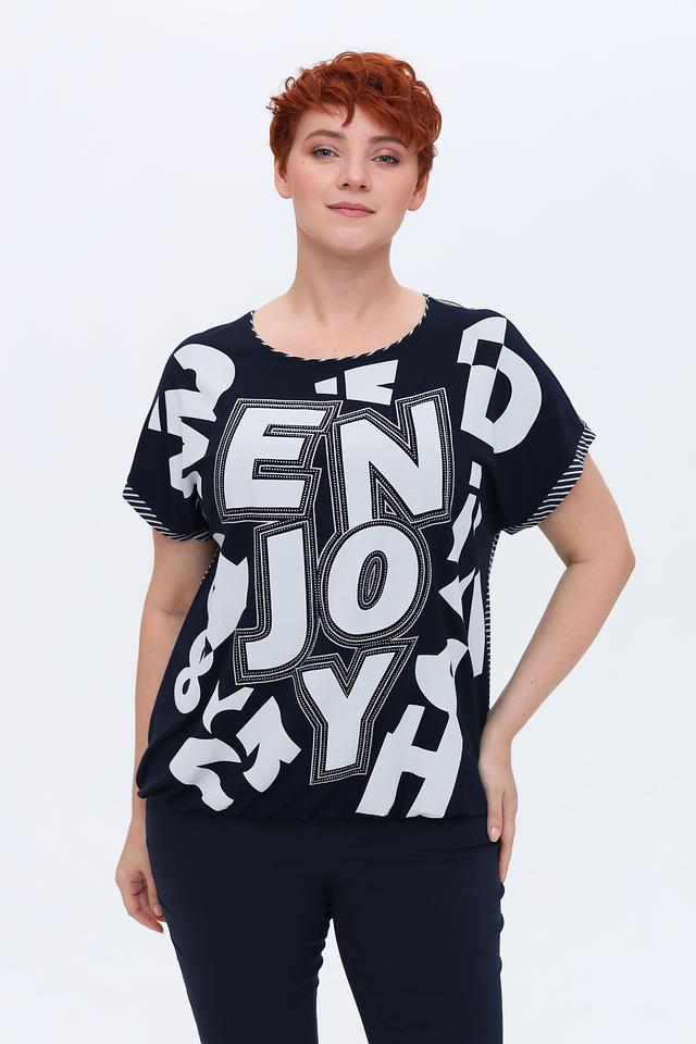 Футболка имеет прямой крой и короткие рукава. Основной цвет – темно-синий, который служит идеальным фоном для яркого белого принта с надписями. Принт выполнен в абстрактном стиле, добавляя образу оригинальности.