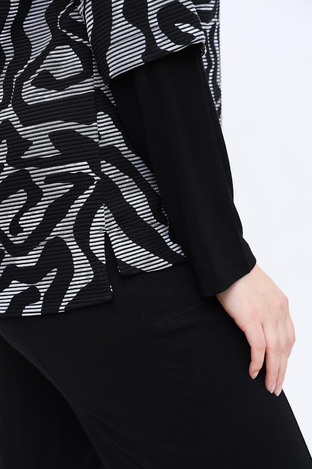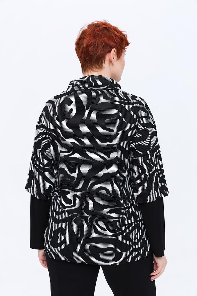 Эта блуза от Via Appia станет ярким акцентом вашего образа. Модель выполнена в сочетании чёрного и белого цветов, украшена абстрактным геометрическим принтом, состоящим из полос и волн.