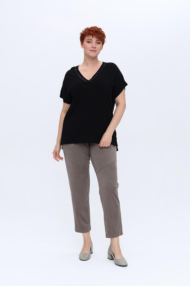Модель имеет V-образный вырез, который визуально удлиняет шею и делает силуэт более изящным. Особый акцент в дизайне – деликатная отделка стразами по краю выреза, придающая изделию праздничный вид.