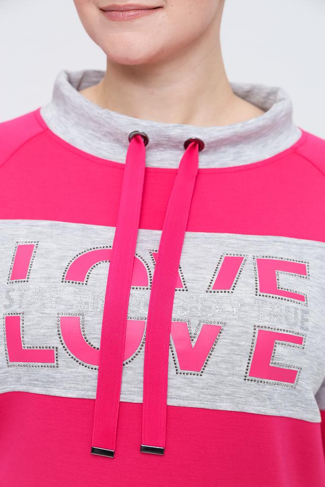 Передняя часть пуловера украшена крупной надписью LOVE, выполненной в контрастном цвете. Дополнительным элементом дизайна являются шнурки на воротнике-стойке.