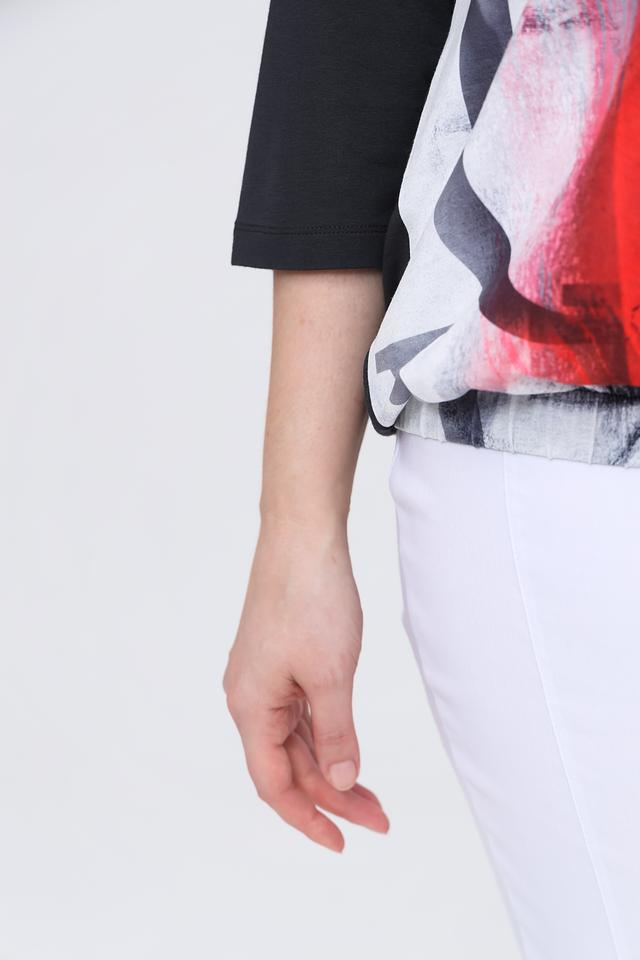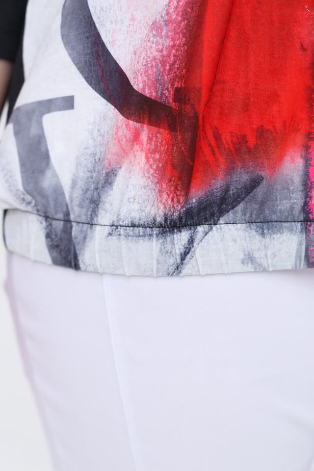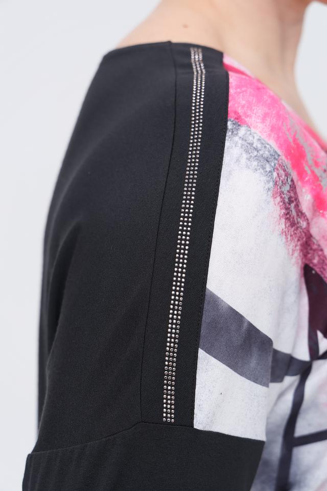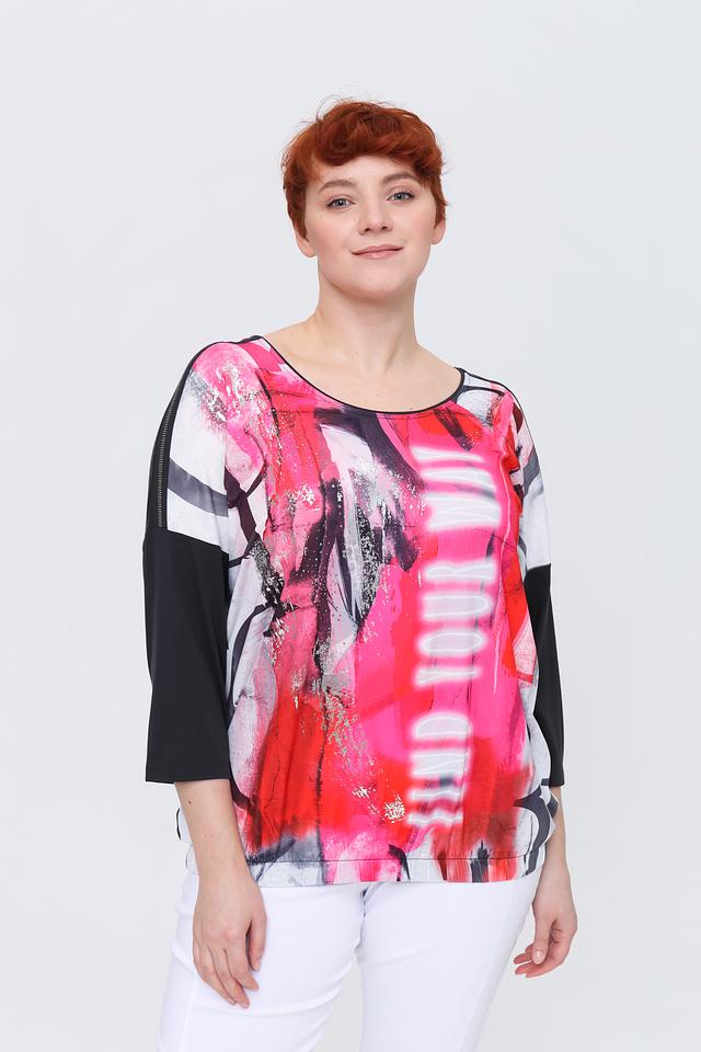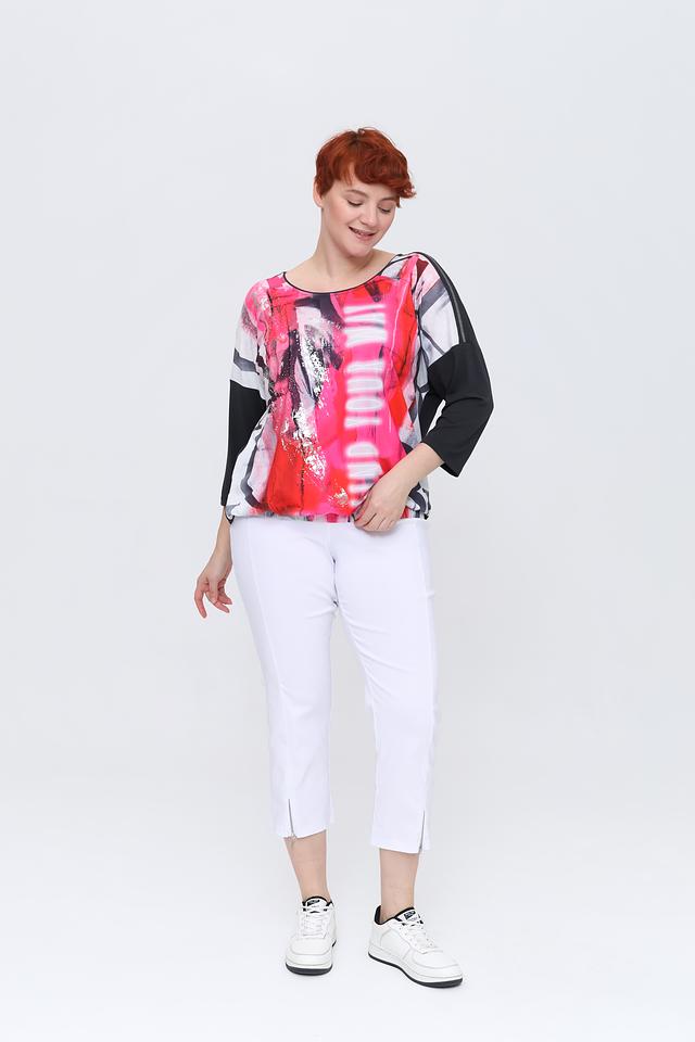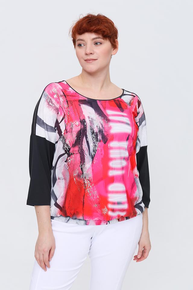 Футболка имеет свободный крой, короткий рукав 3/4 и округлый вырез горловины. Главная особенность – эффектный принт в абстрактном стиле, выполненный в насыщенных розовых, красных и черных тонах. Такой рисунок добавит образу оригинальности и индивидуальности.