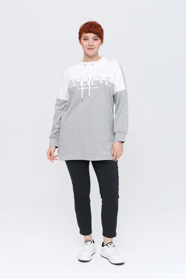 Модель выполнена в сочетании серого и белого цветов, с ярким принтом на лицевой стороне. Пуловер имеет свободный крой, что делает его идеальным для повседневной носки. Капюшон дополнен шнурками.