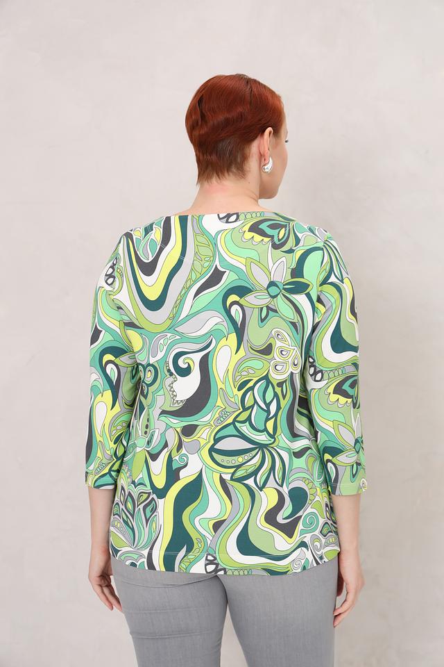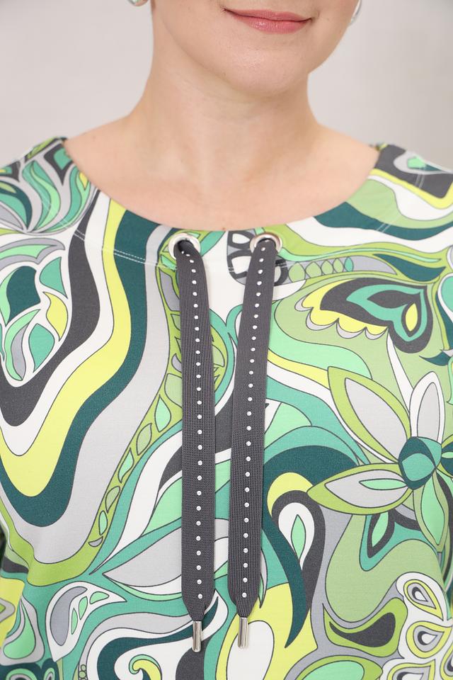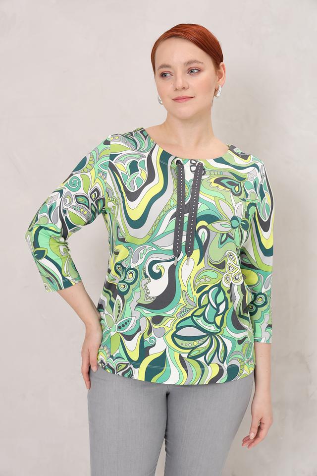 Блуза имеет оригинальный принт в абстрактном стиле, выполненный в различных оттенках зеленого. Вырез горловины дополнен шнурком с металлическими кольцами, что придает модели особый шарм.