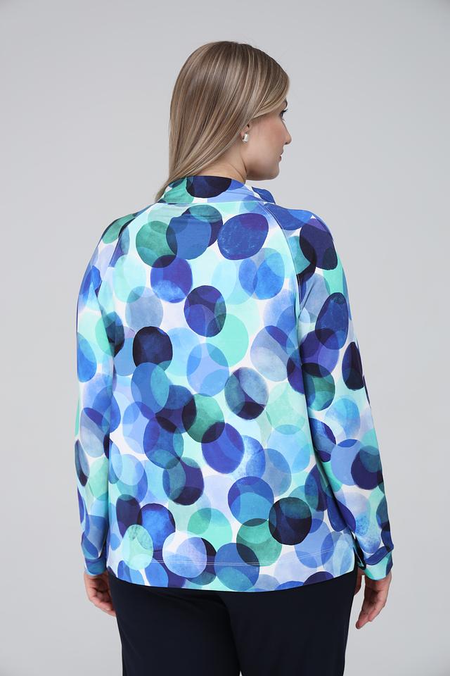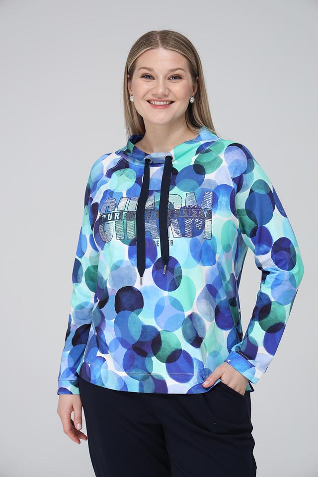 Пуловер имеет свободный крой, длинные рукава и удобный капюшон. Основной цвет изделия – бирюзовый, дополненный ярким и необычным принтом из разноцветных кругов. Декоративные элементы в виде надписи добавляют оригинальности.