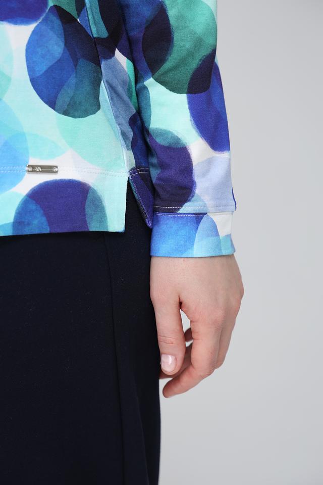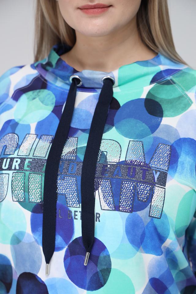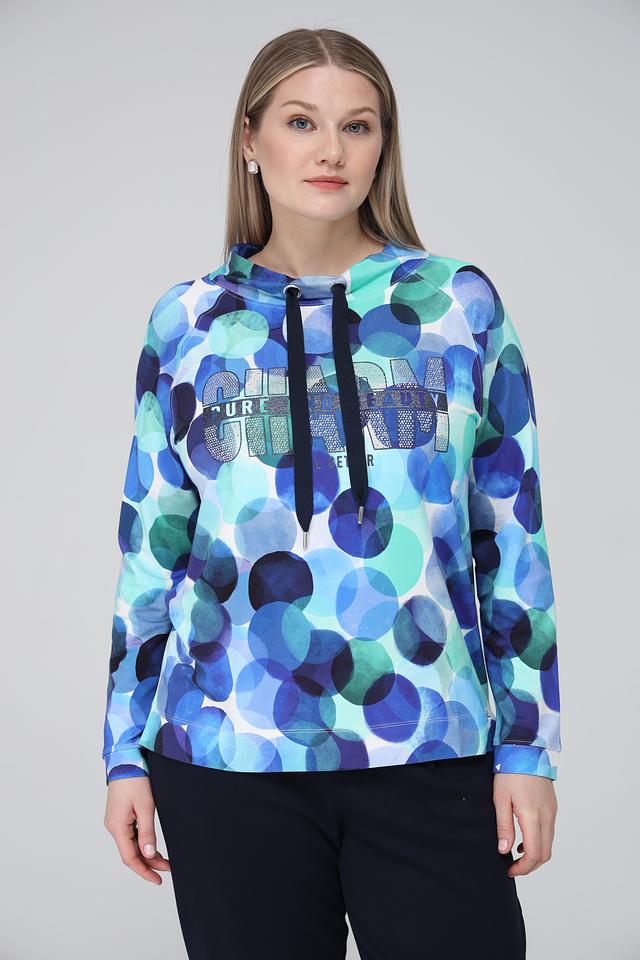 Женский пуловер Via Appia бирюзового цвета с оригинальным принтом в виде разноцветных кругов. Модель с капюшоном и длинными рукавами, выполненная из мягкой и приятной к телу вискозы с добавлением эластана. Состав: вискоза 95%, эластан 5%
