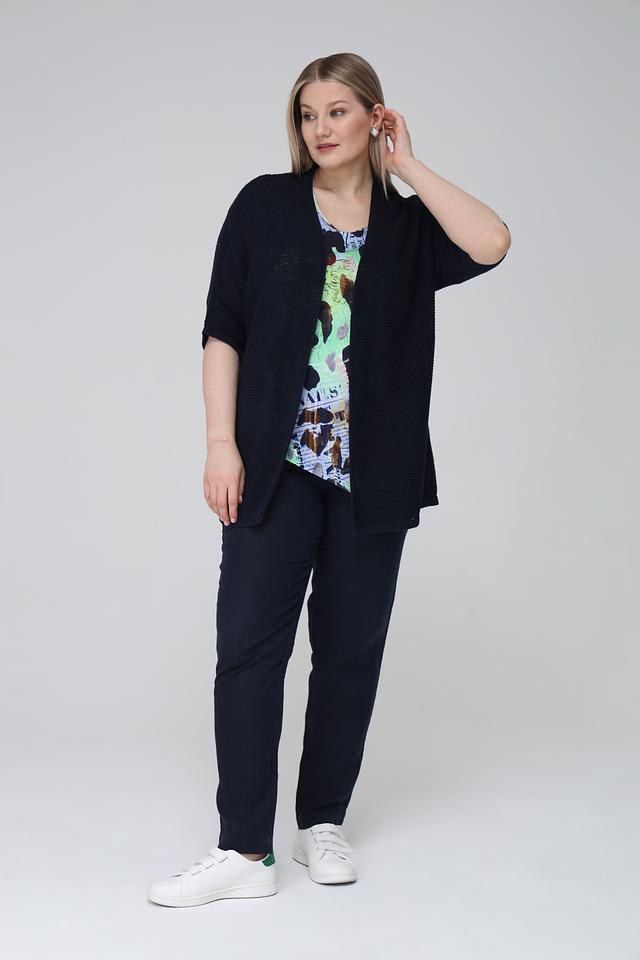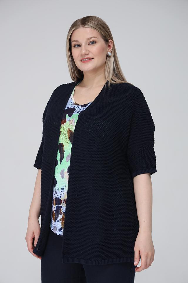Жакет имеет короткий рукав 3/4 и свободный крой, что обеспечивает комфорт в носке. Фактурная вязка придает изделию оригинальность и визуальный интерес.