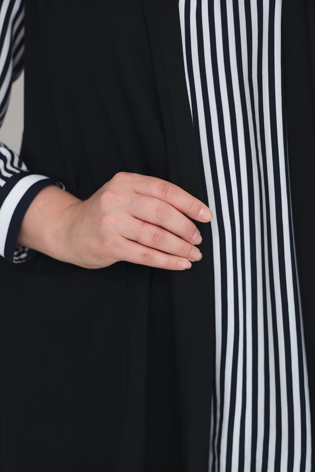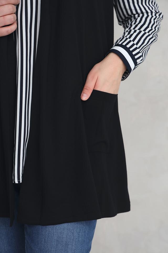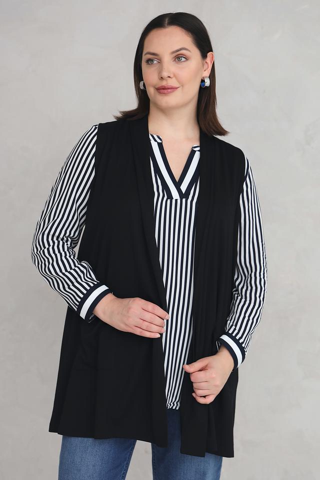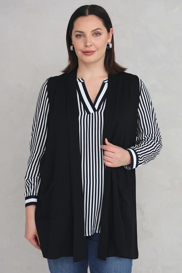 Жилет имеет удлинённый крой и свободный силуэт, что обеспечивает комфортную посадку по фигуре. Отсутствие застёжки делает его лёгким и удобным в носке. Материал – сочетание вискозы, полиамида и эластана – приятен к телу и хорошо держит форму.