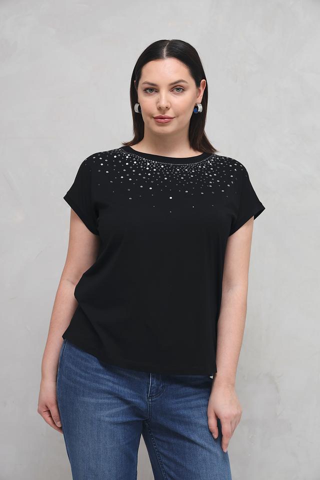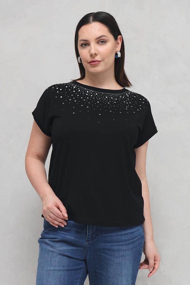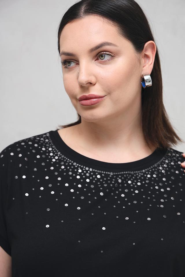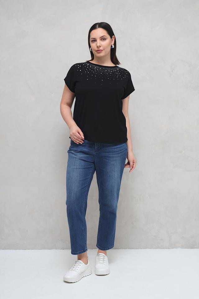 Особенностью данной модели является декор в виде россыпи камней на вырезе горловины, что придает ей изысканность и привлекательность. Короткие рукава делают футболку идеальным выбором для теплой погоды.