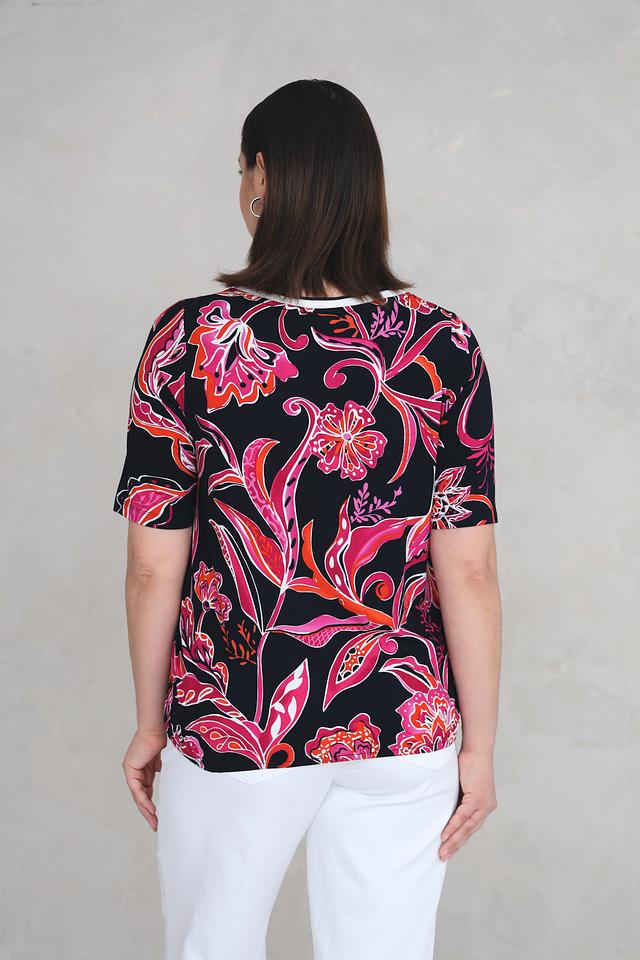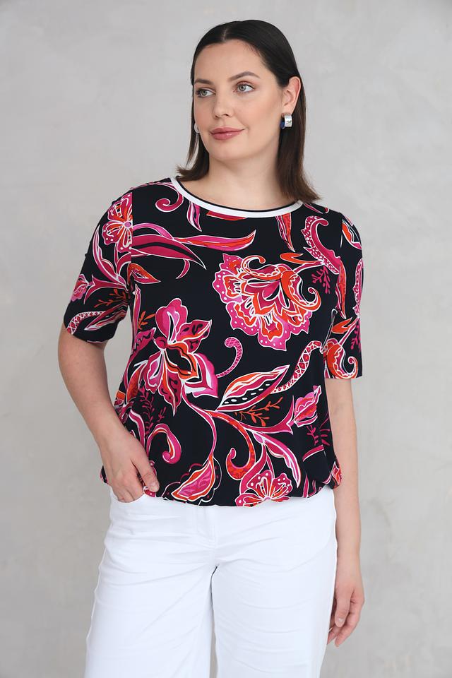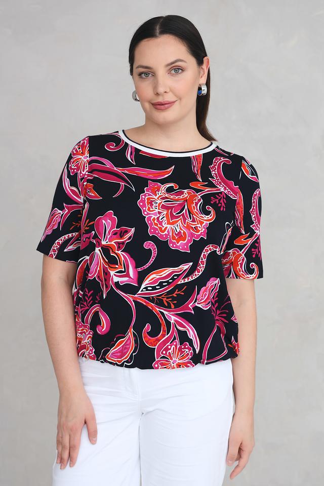 Женская футболка Via Appia черного цвета с ярким цветочным принтом станет стильным дополнением к вашему гардеробу. Модель выполнена из мягкой вискозы с добавлением эластана, обеспечивающего комфортную посадку. Состав: вискоза 94%, эластан 6%