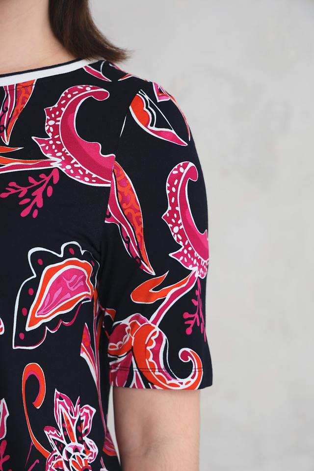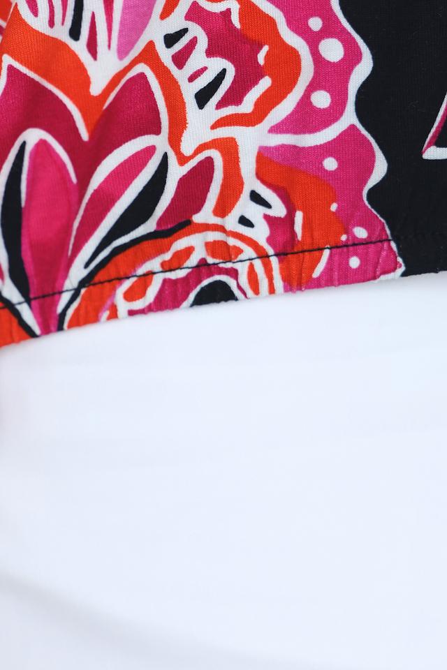 Основной цвет футболки – черный, который служит прекрасным фоном для красочного цветочного принта. Рисунок выполнен в оттенках розового, красного и оранжевого, создавая эффектный контраст.