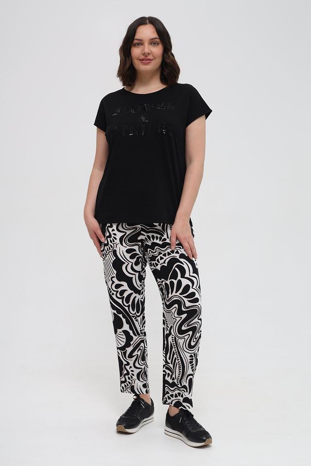 Женские брюки Via Appia DUE чёрно-белого цвета с оригинальным абстрактным принтом. Модель выполнена из мягкой вискозы, обеспечивающей комфорт в носке, и дополнена эластичным поясом с кулиской. Состав: вискоза 100%