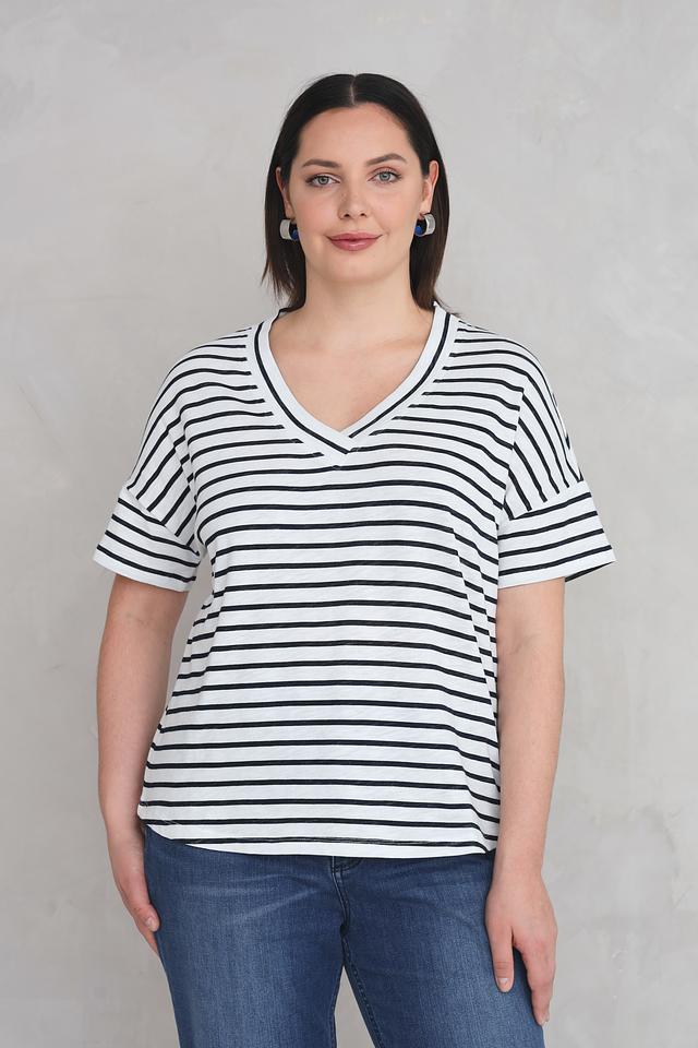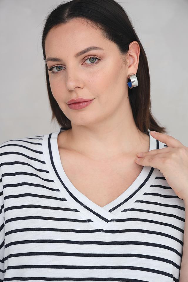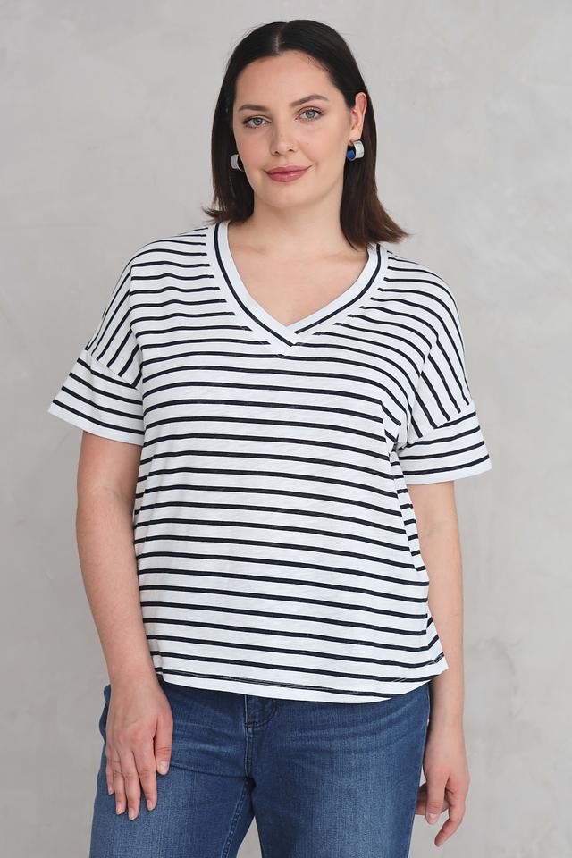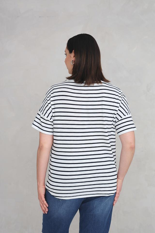Классический дизайн в бело-синюю полоску делает эту футболку универсальной и легко сочетаемой с различными элементами одежды. V-образный вырез горловины подчеркивает женственность, а короткие рукава с манжетами придают образу аккуратность.