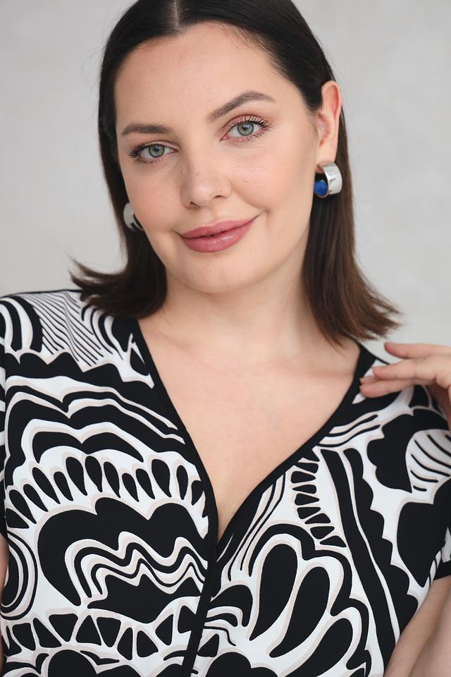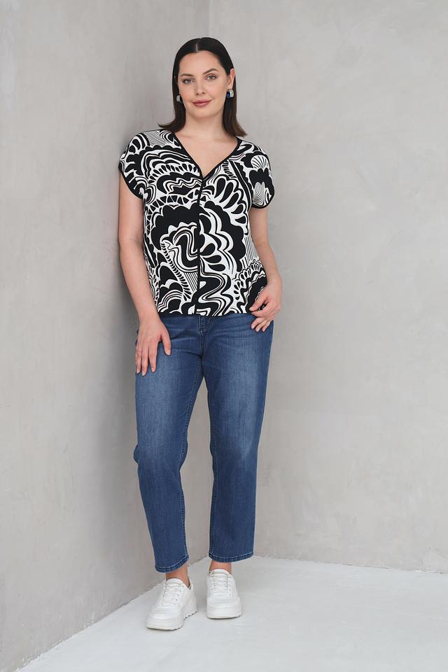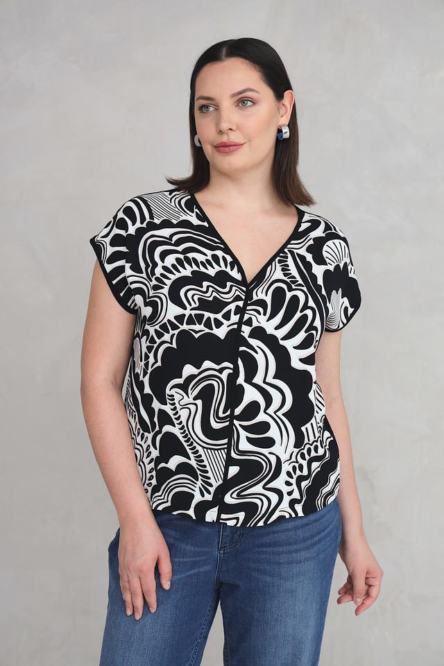 Блуза Via Appia чёрно-белого цвета с оригинальным абстрактным принтом. Модель с V-образным вырезом и короткими рукавами, выполненная из мягкой и приятной к телу вискозы с добавлением эластана. Состав: вискоза 94%, эластан 6%