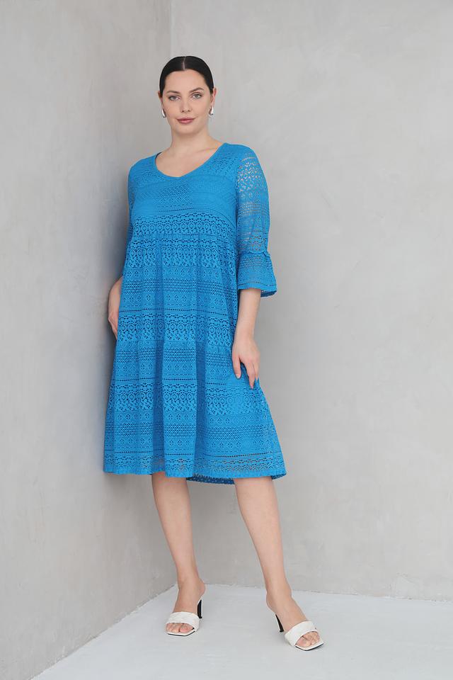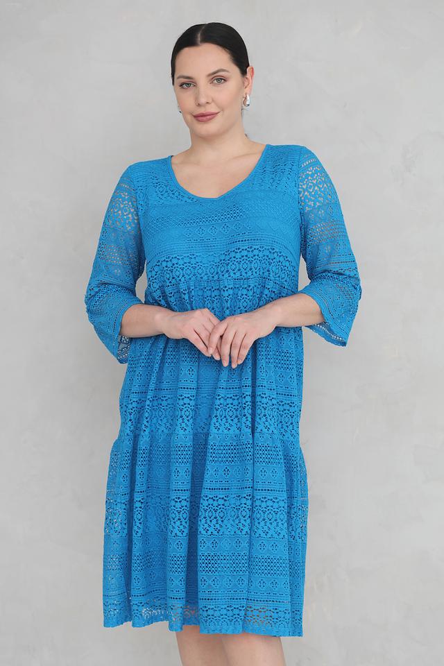 Платье имеет яркий бирюзовый цвет и полностью выполнено из ажурного кружева, что придает ему особую изысканность и воздушность. V-образный вырез горловины и рукава длиной 3/4 подчеркивают женственность силуэта.