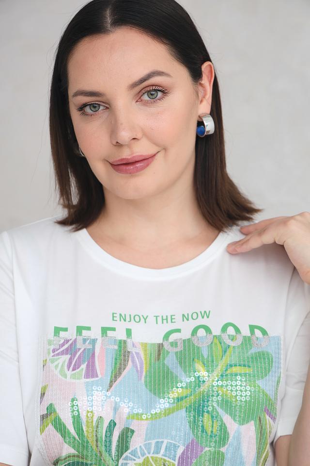 Основным акцентом футболки является яркий и красочный тропический принт, который добавляет образу свежести и летнего настроения. Надпись "ENJOY THE NOW" придает футболке позитивный и вдохновляющий посыл.