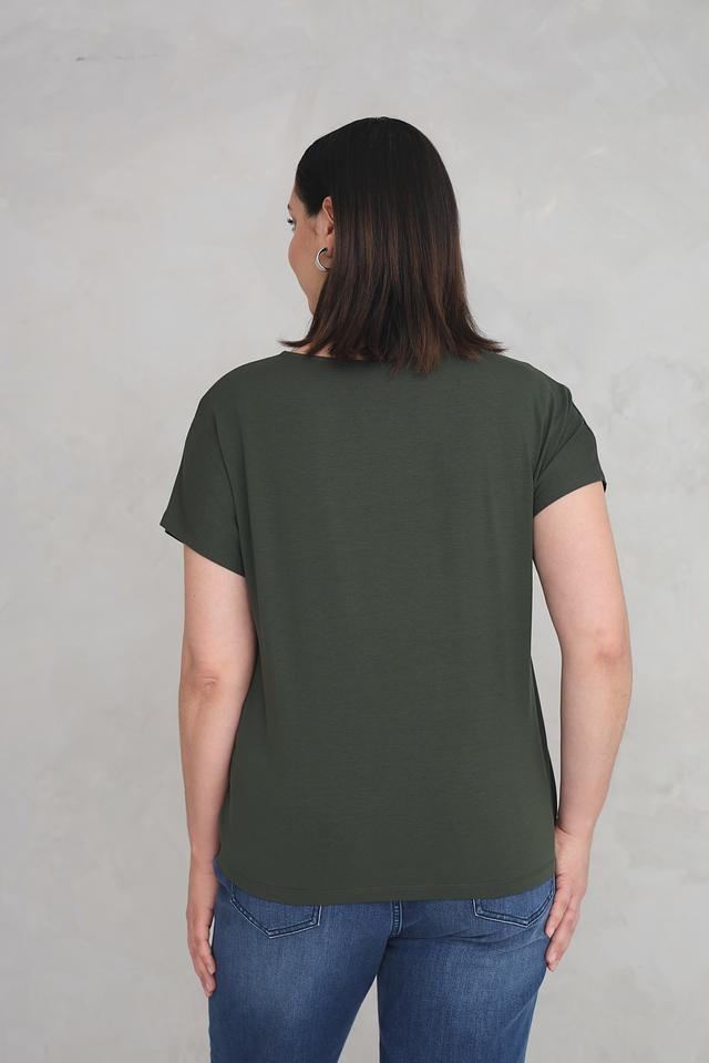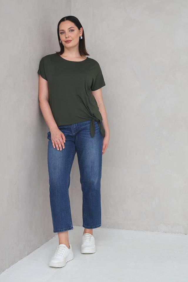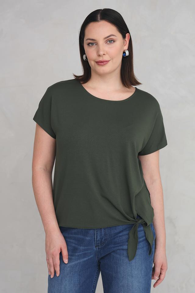 Женская футболка Via Appia цвета хаки с короткими рукавами и завязкой на талии. Изготовлена из мягкой вискозы с добавлением эластана для комфорта и хорошей посадки. Состав: вискоза 94%, эластан 6%