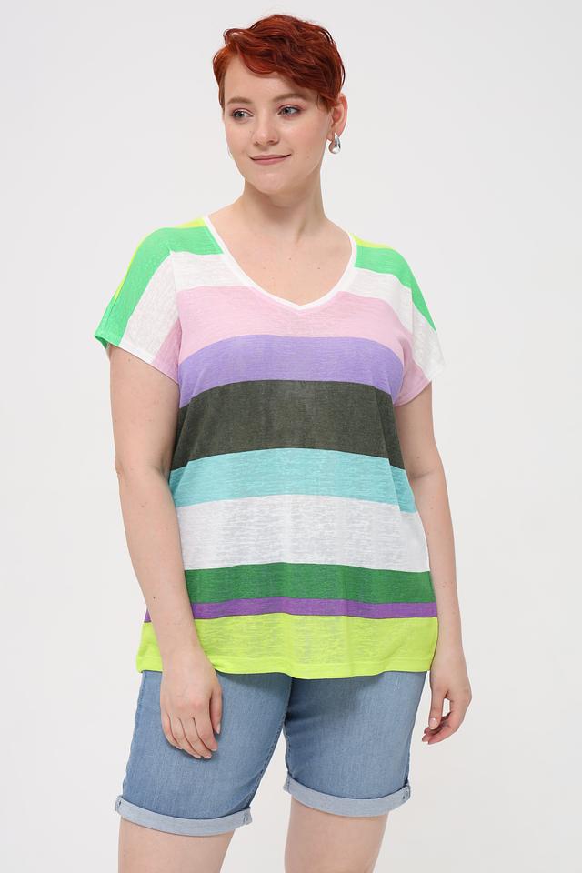 Женская футболка Via Appia выполнена в яркой полосатой расцветке. Модель имеет свободный крой и V-образный вырез, что обеспечивает комфорт и стиль в повседневном образе. Изготовлена из мягкой вискозы с добавлением полиэстера. Состав: вискоза 70%, полиэстер 30%