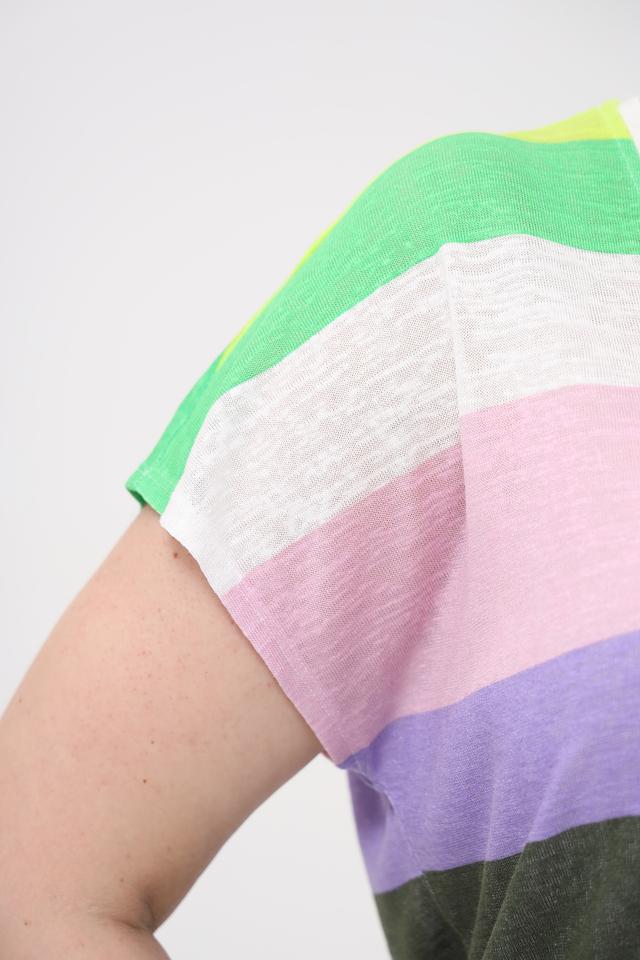 Эта стильная футболка от Via Appia станет отличным дополнением к вашему гардеробу. Модель выполнена в яркой полосатой расцветке, сочетающей в себе оттенки зелёного, розового, фиолетового и хаки.