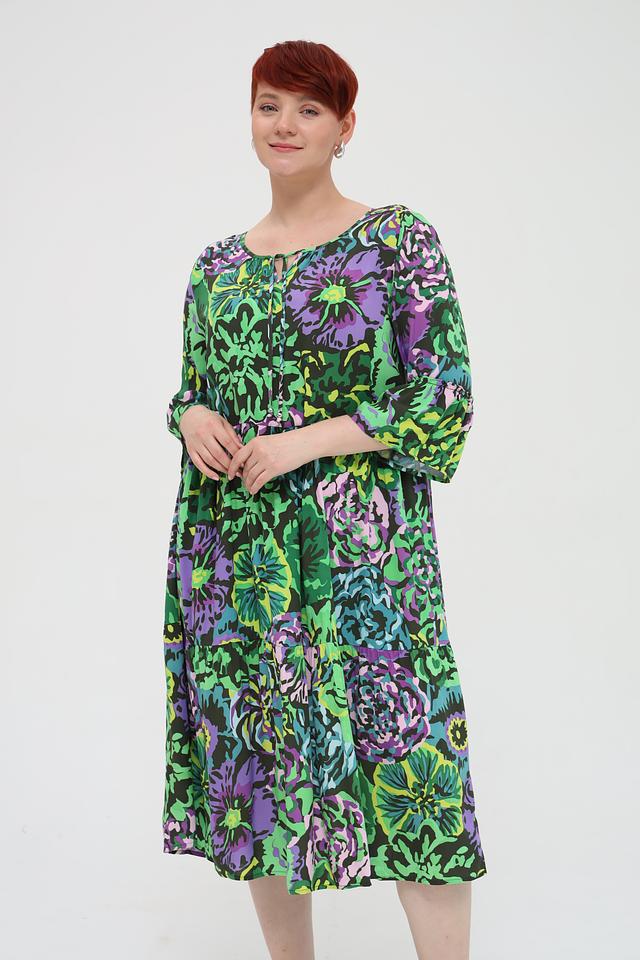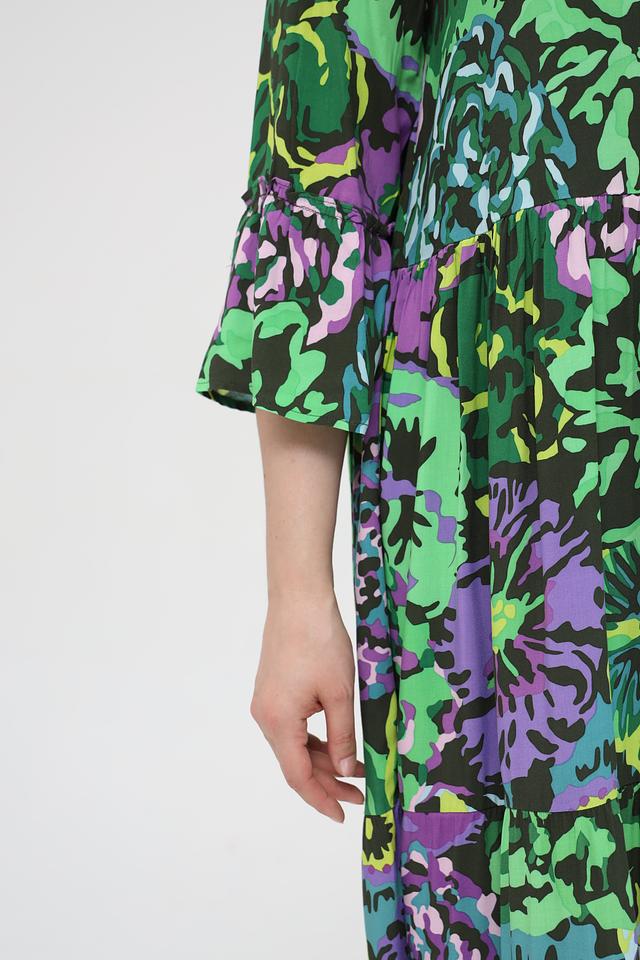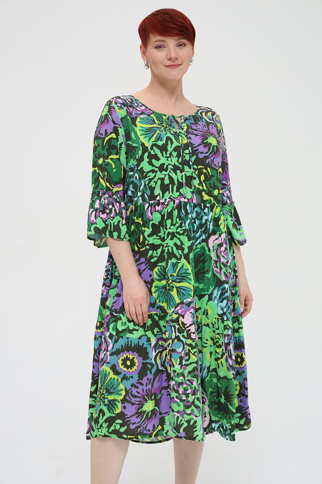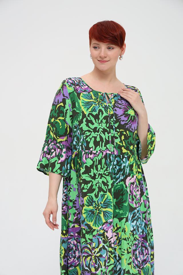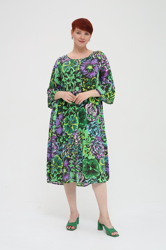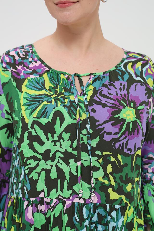 Платье имеет яркий цветочный принт, сочетающий в себе оттенки зеленого, фиолетового и черного. Вырез горловины округлый, а рукава – три четверти с небольшими воланами. Талия слегка приталена, что подчеркивает женственность силуэта.