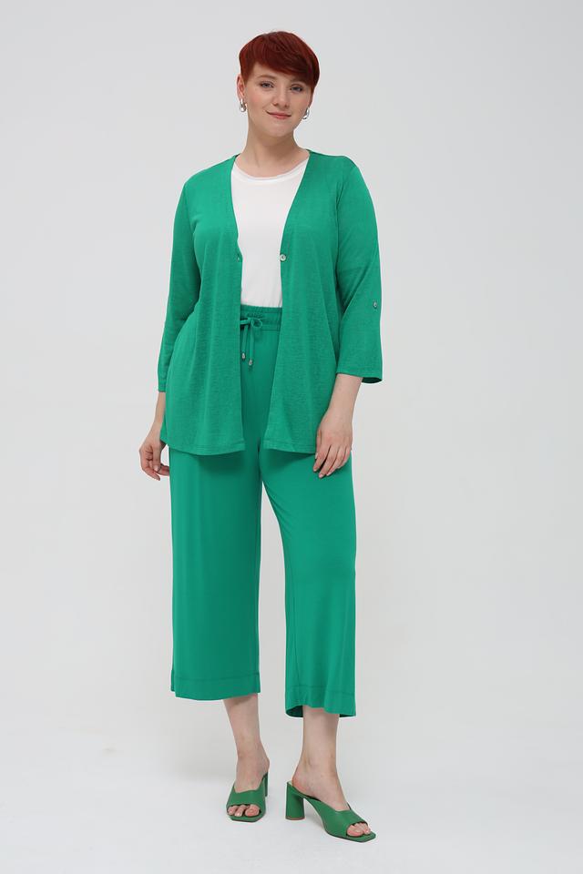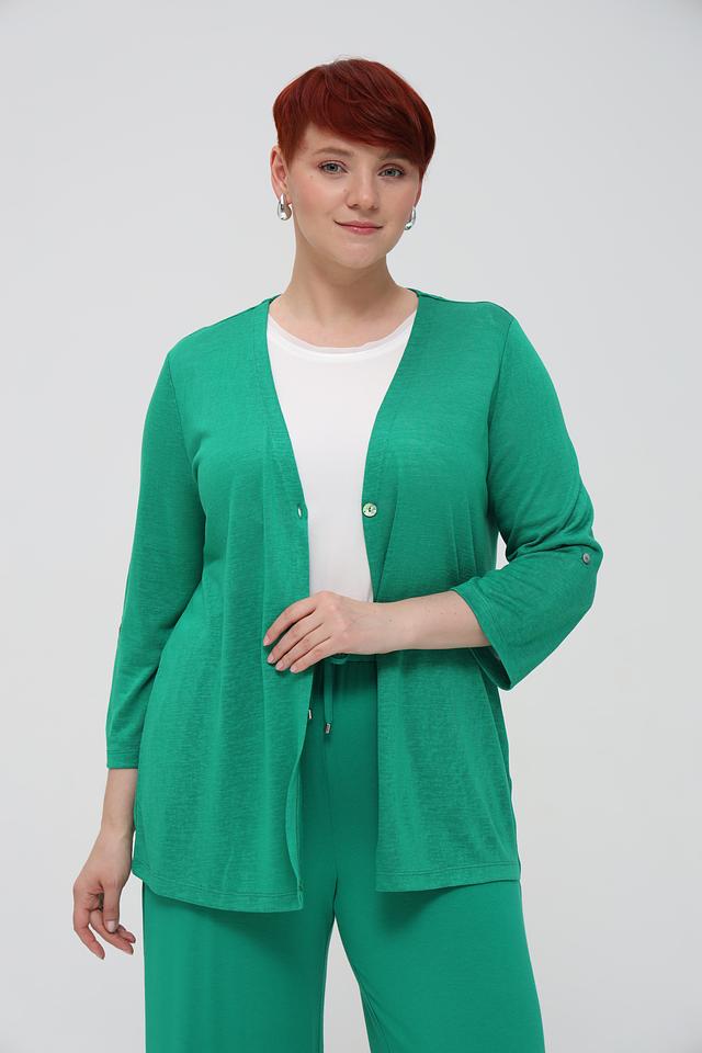 Состав ткани: 70% вискоза, 30% полиэстер. Вискоза обеспечивает мягкость и комфорт, а полиэстер – износостойкость и простоту в уходе. Жакет идеально сочетается с брюками, юбками и платьями, создавая стильные и элегантные образы.