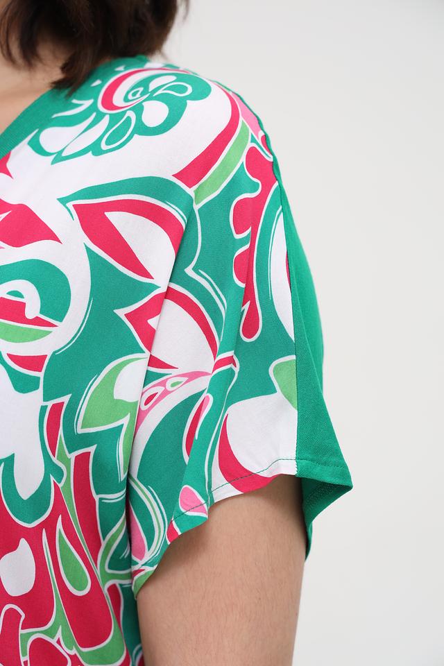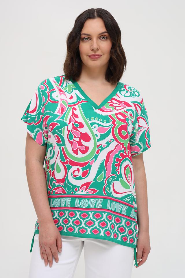 Блуза Via Appia зеленого цвета с ярким цветочным принтом и надписью "LOVE". Модель свободного кроя с V-образным вырезом и короткими рукавами, выполнена из мягкой вискозы с добавлением эластана. Состав: вискоза 94%, эластан 6%