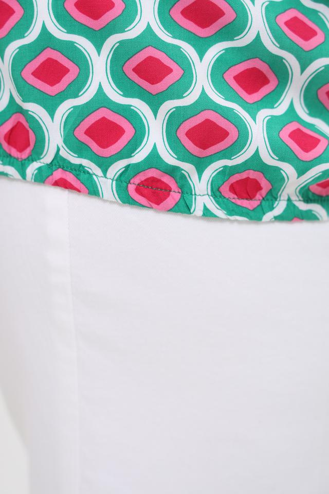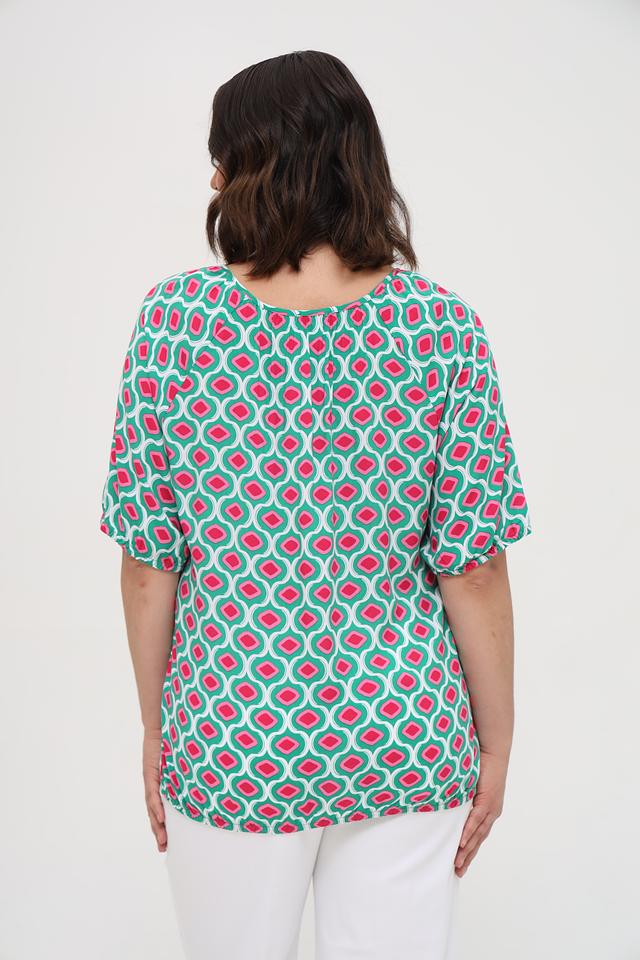 Особенностью данной модели является яркий геометрический принт, сочетающий в себе оттенки зеленого, розового и белого. Круглый вырез горловины дополнен небольшим сборкой и завязками, что придает блузе женственности и изящества. Короткие рукава делают ее идеальной для теплой погоды.