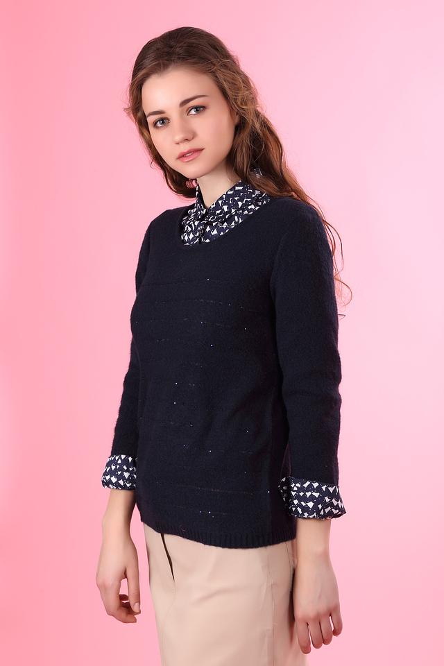 Тёмно-синий пуловер Via Appia с длинными рукавами и аккуратной вышивкой. Модель выполнена из мягкого трикотажа с добавлением шерсти, что обеспечивает комфорт и тепло. Прекрасный выбор для создания стильного и уютного образа. Состав: полиакрил 57%, полиамид 29%, шерсть 8%, эластан 4%, полиэстер 2%