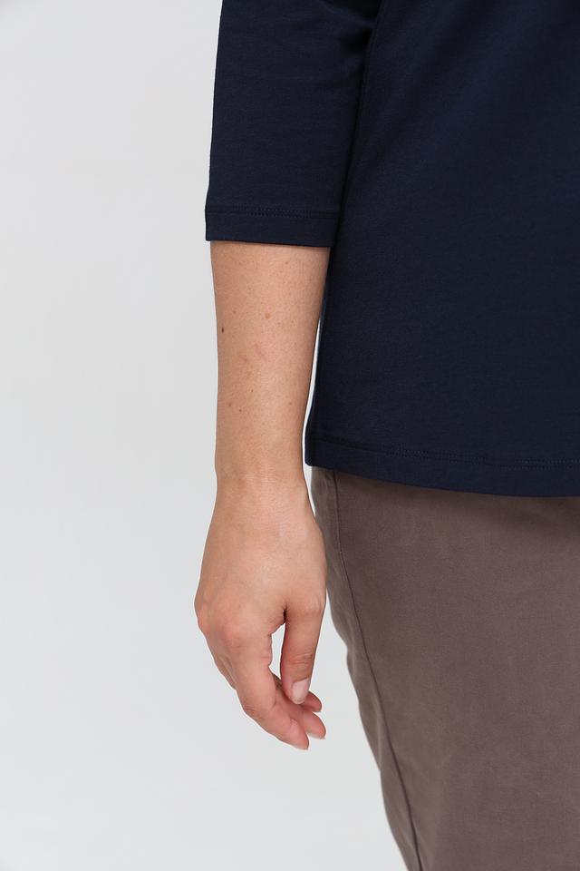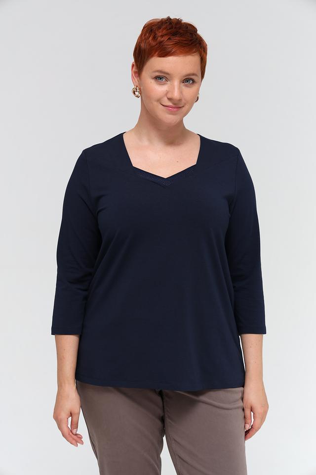 Женская футболка Via Appia DUE темно-синего цвета с рукавом 3/4 и V-образным вырезом. Изготовлена из мягкого и приятного к телу сочетания хлопка и модала, обеспечивающего комфорт в носке. Состав: хлопок 47%, модал 47%, эластан 6%