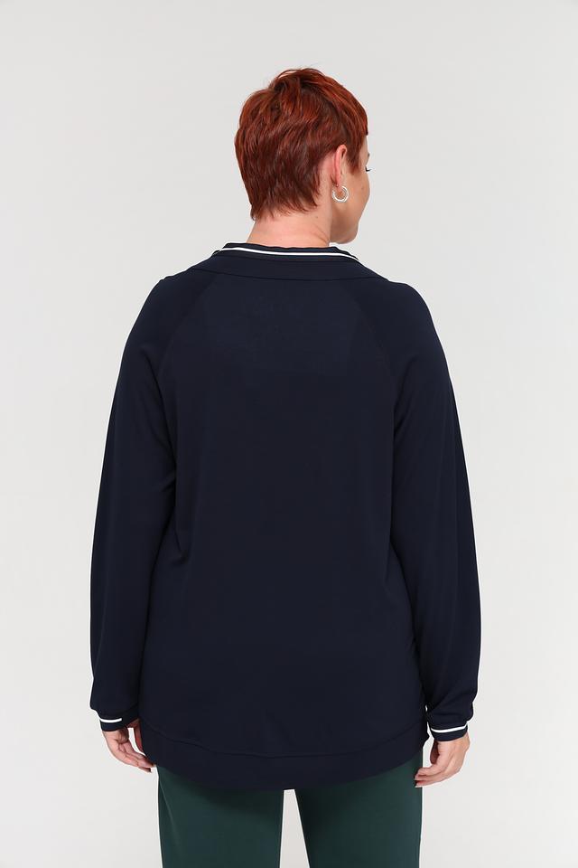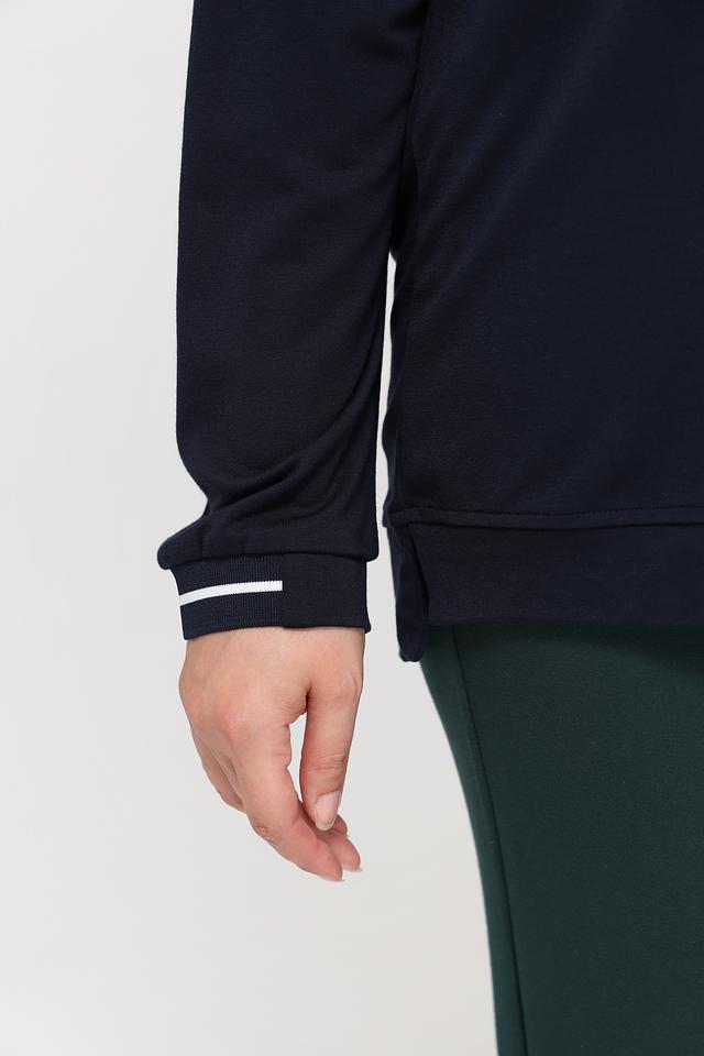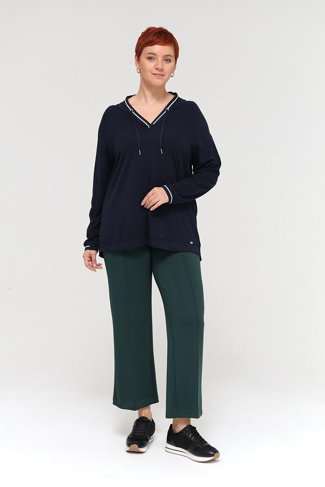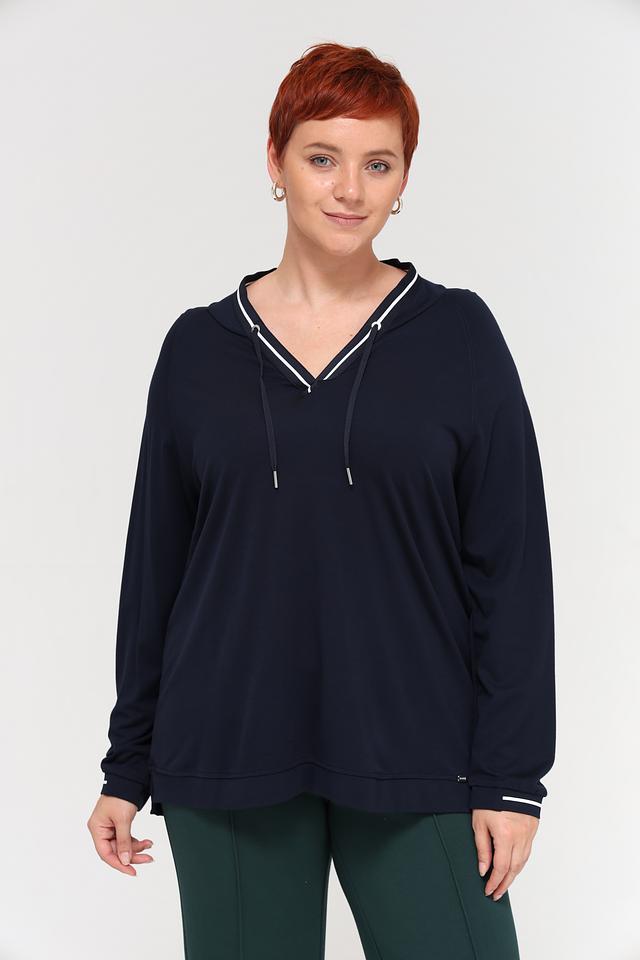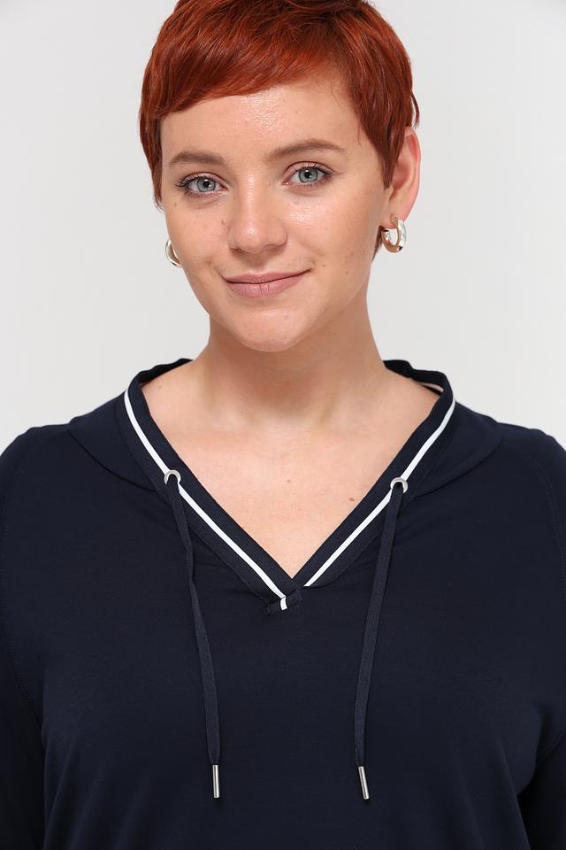 Женская футболка Via Appia DUE темно-синего цвета с капюшоном и белой отделкой. Модель выполнена из мягкой вискозы с добавлением полиамида и эластана для комфорта и хорошей посадки. Состав: вискоза 80%, полиамид 16%, эластан 4%