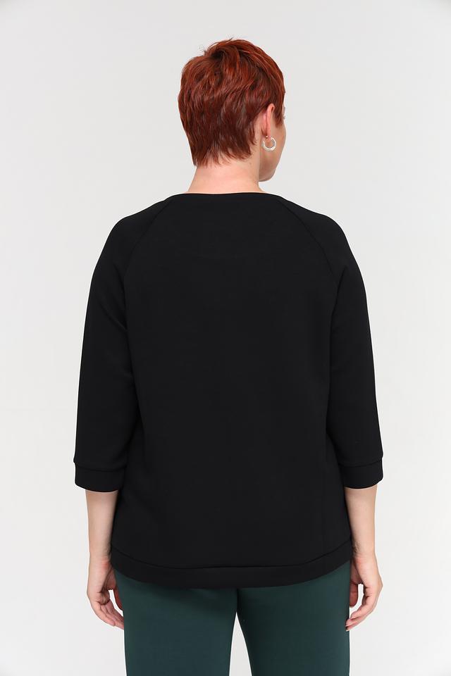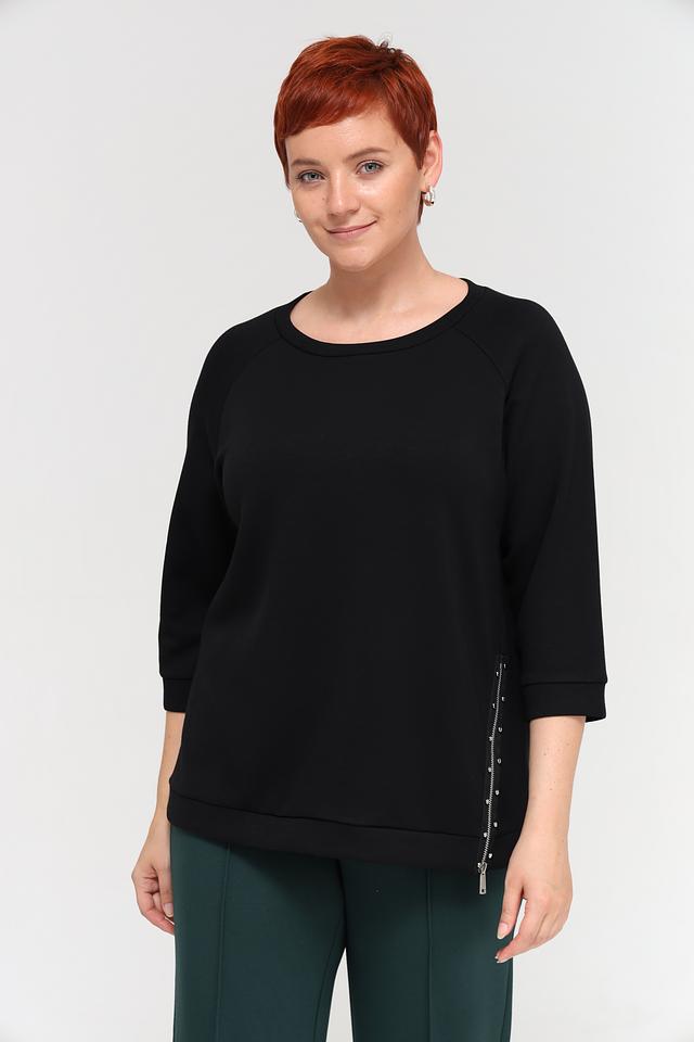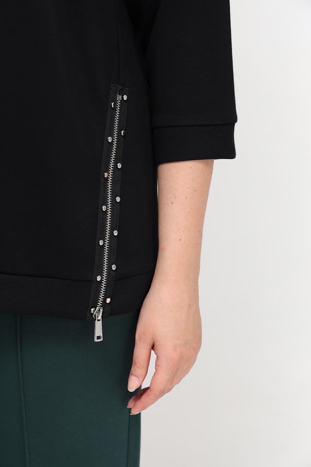 Пуловер имеет длину до бедра и рукава три четверти, что делает его универсальным для различных образов. Декоративные молнии на рукавах добавляют изделию современный акцент и оригинальность.