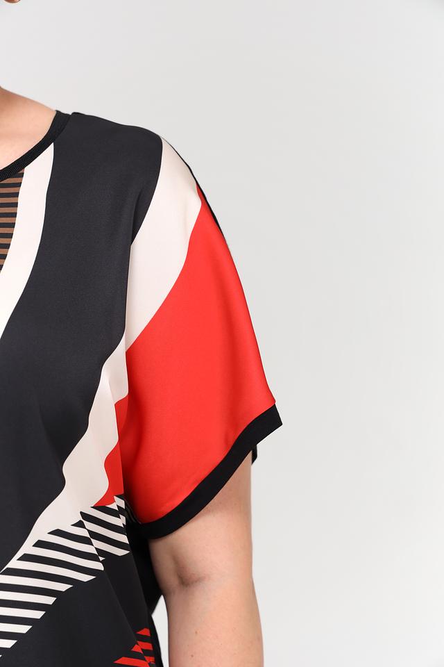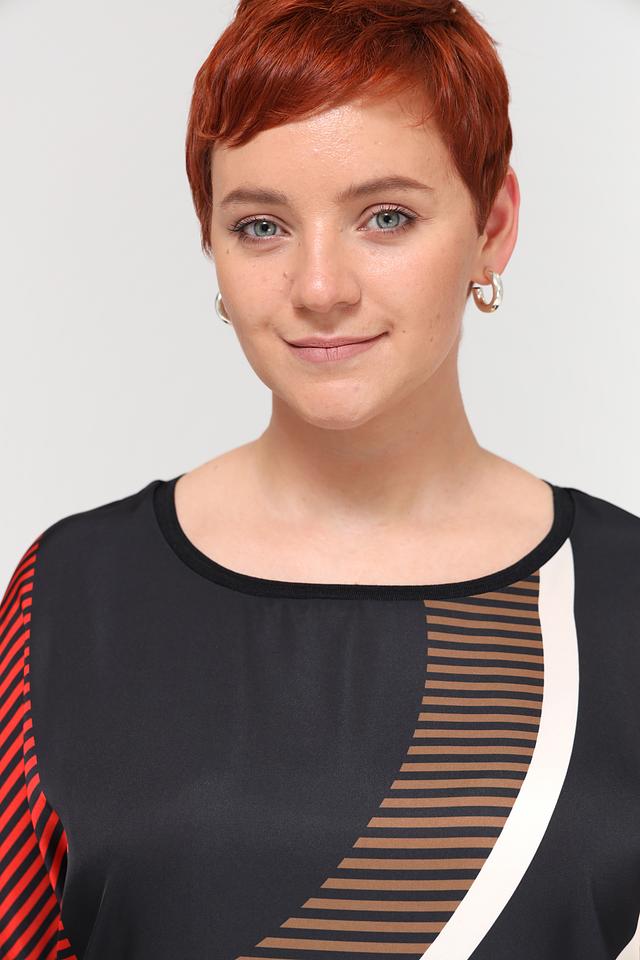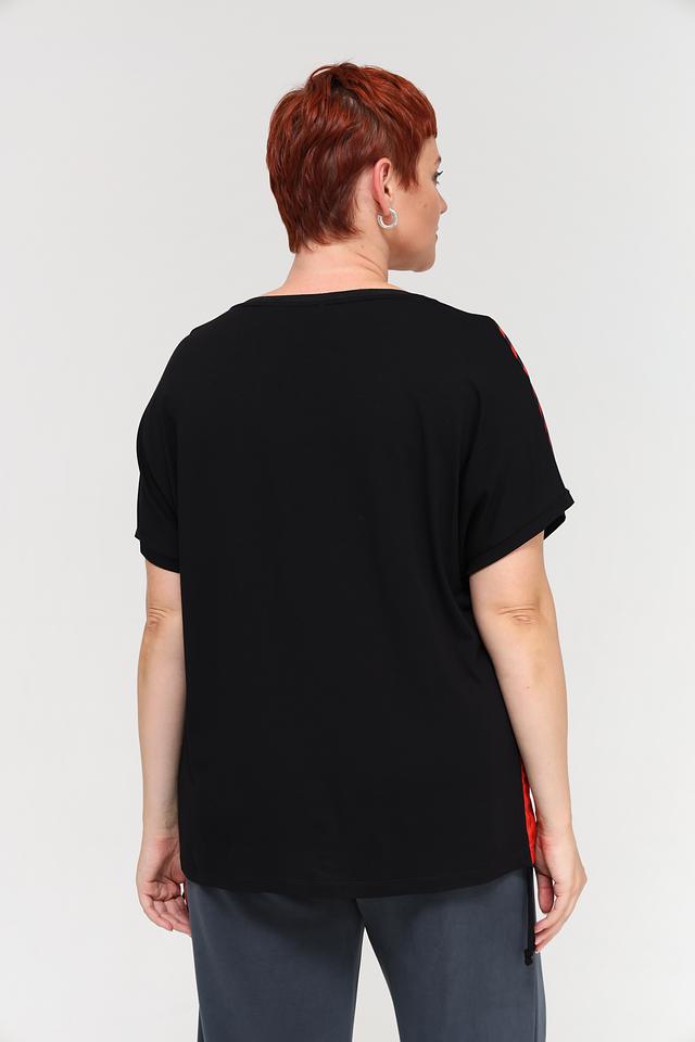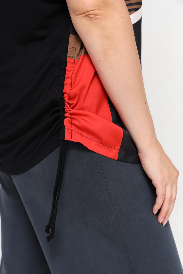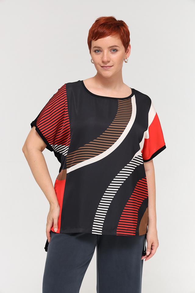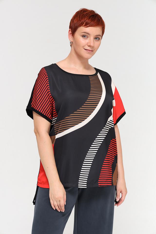 Блуза имеет свободный крой и короткие рукава, что делает ее идеальным выбором для теплой погоды. Особенностью модели является яркий геометрический принт, сочетающий в себе красный, белый и бежевый цвета на черном фоне. Такой рисунок добавит образу оригинальности и динамики.
