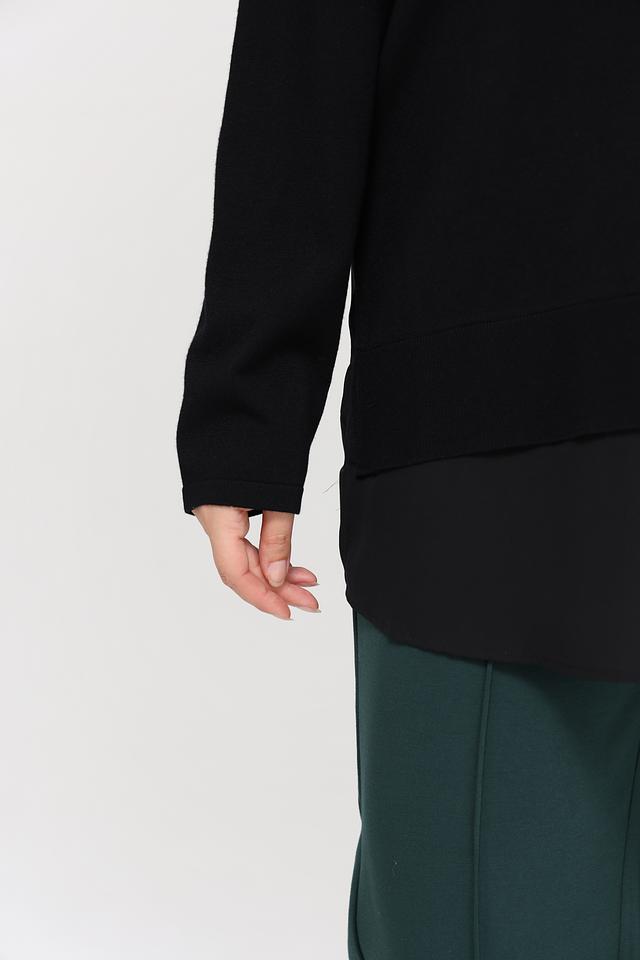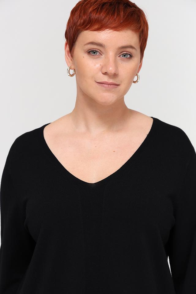 Пуловер имеет классический V-образный вырез, который визуально удлиняет шею и делает образ более изящным. Особенностью данной модели является асимметричный удлиненный крой с воланом, добавляющим динамику и лёгкость.