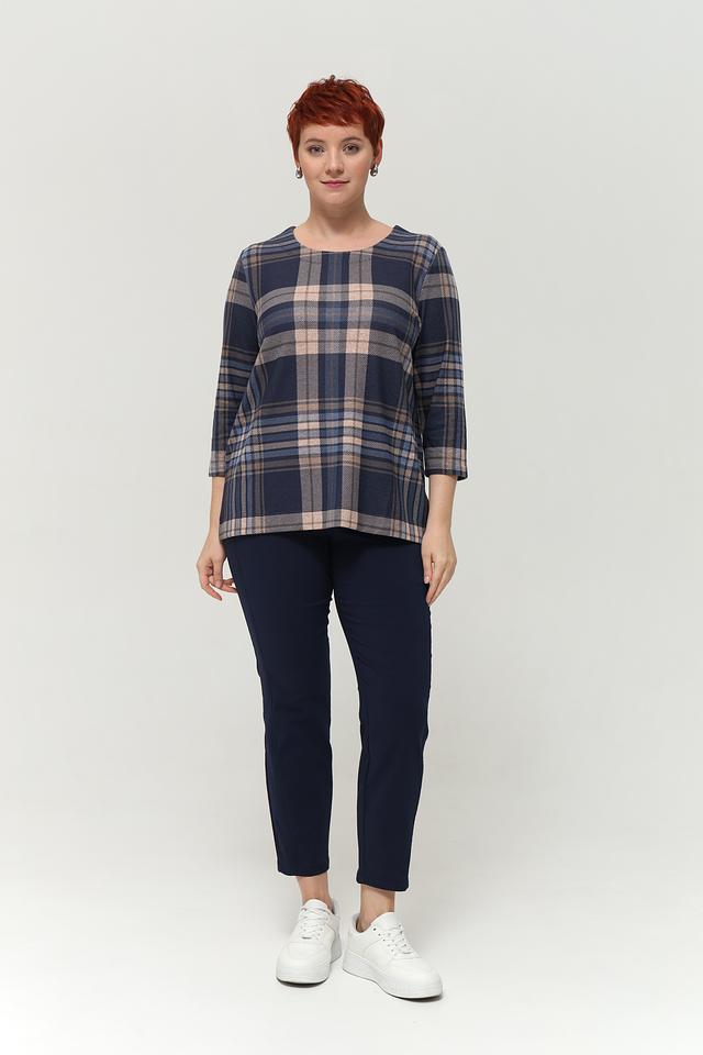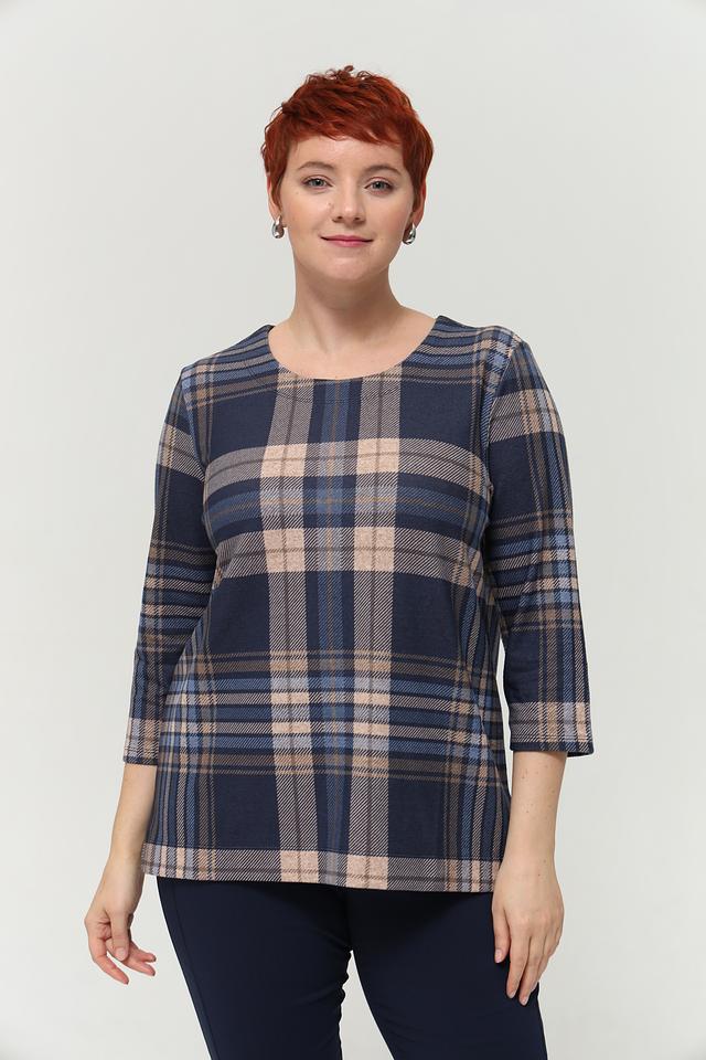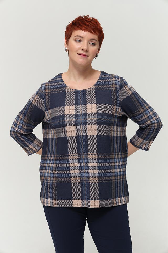 Пуловер имеет классический крой и круглый вырез горловины. Его отличает яркий клетчатый принт в синих, бежевых и коричневых тонах, который придаёт изделию особый шарм.