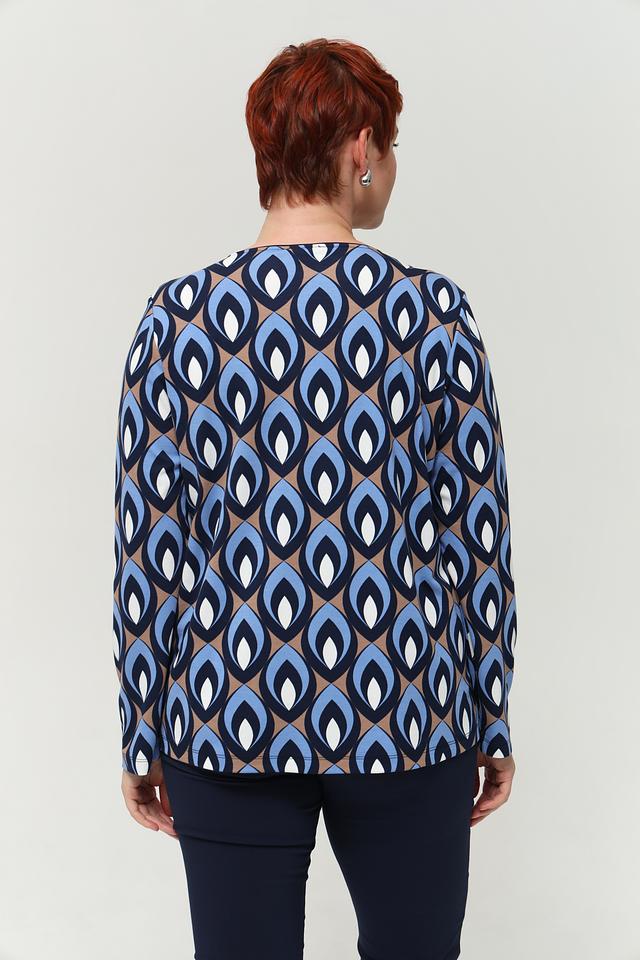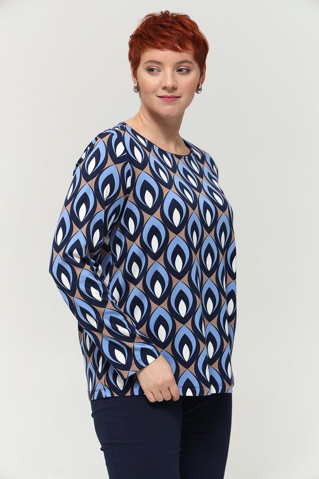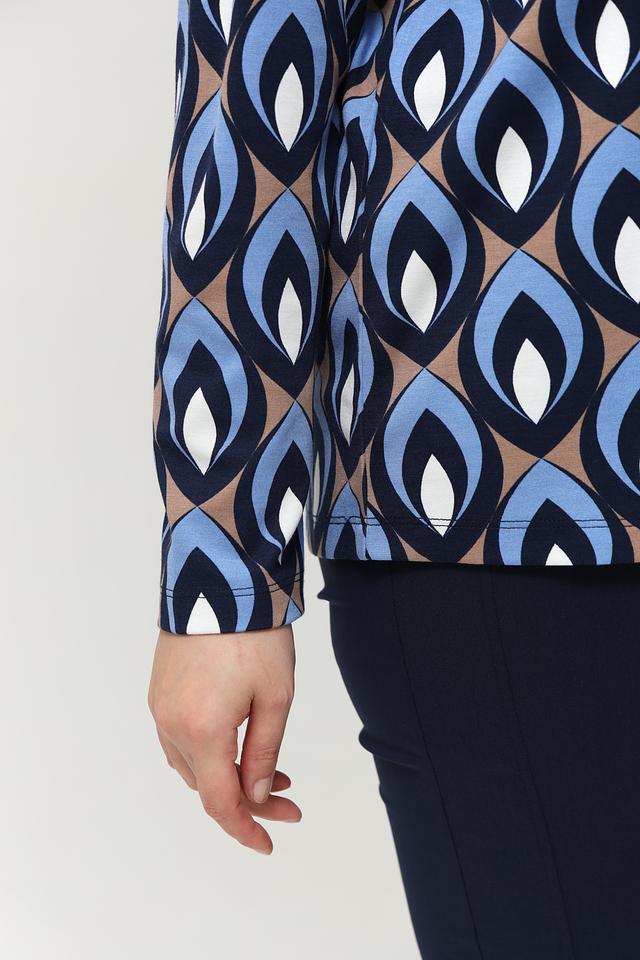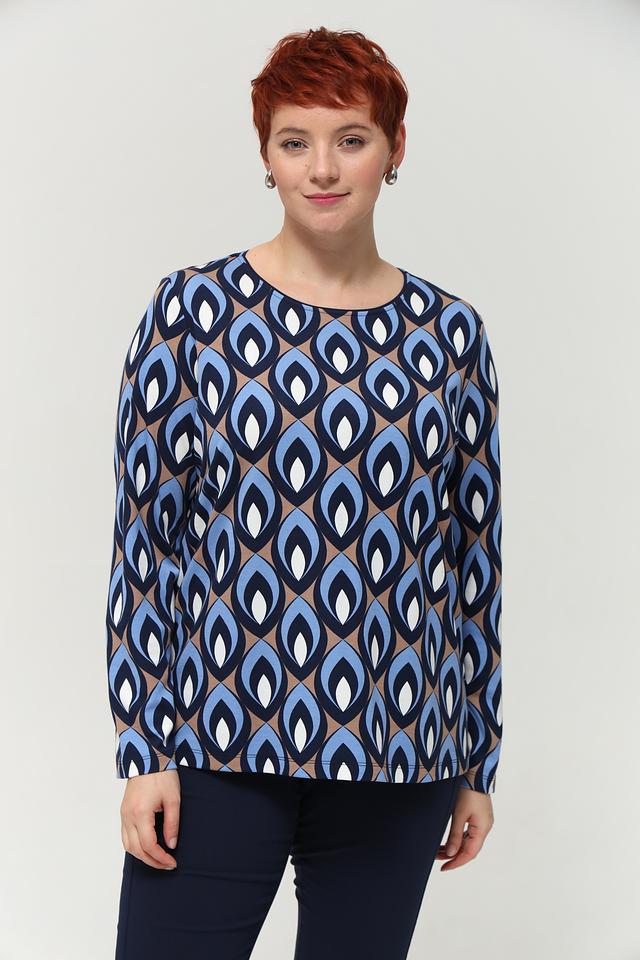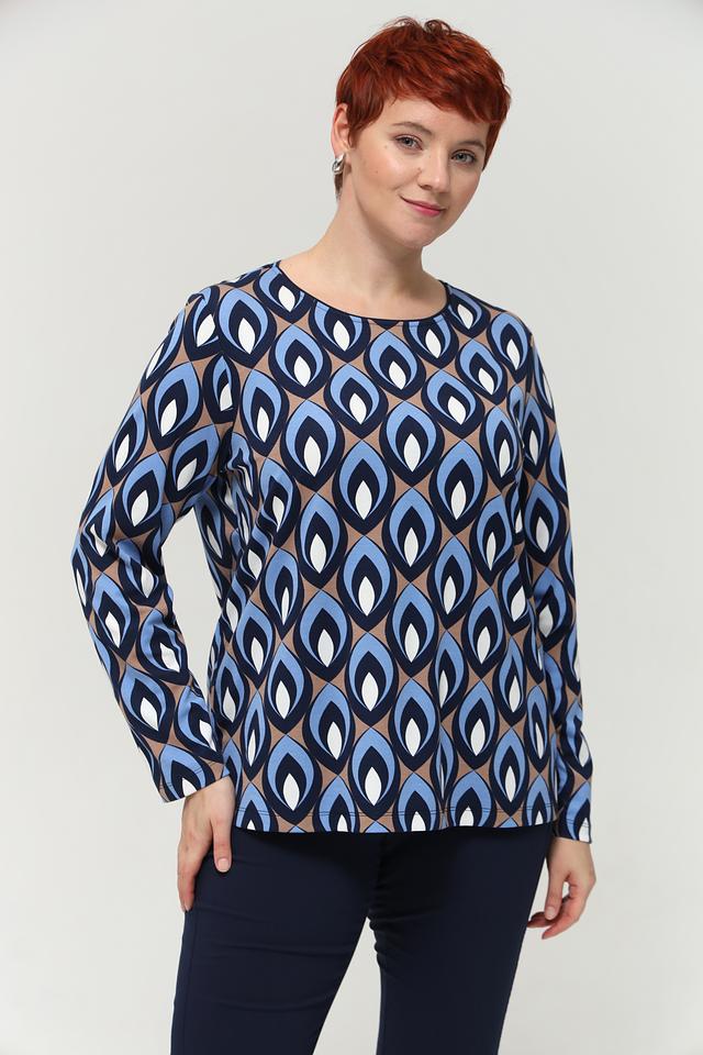 Женская футболка Via Appia DUE синего цвета с оригинальным геометрическим принтом. Изготовлена из мягкой вискозы с добавлением полиамида и эластана для комфорта и хорошей посадки. Состав: вискоза 80%, полиамид 16%, эластан 4%