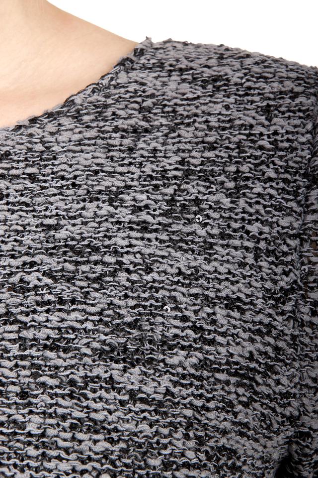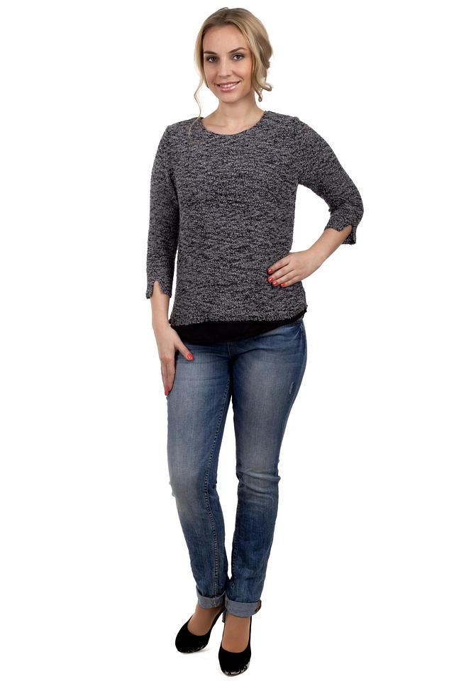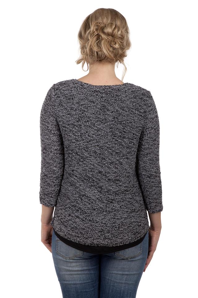 Модель имеет округлый вырез горловины и рукав три четверти, что делает ее универсальной для различных образов. Цвет пуловера – серый меланж, который легко сочетается с другими цветами и фактурами.