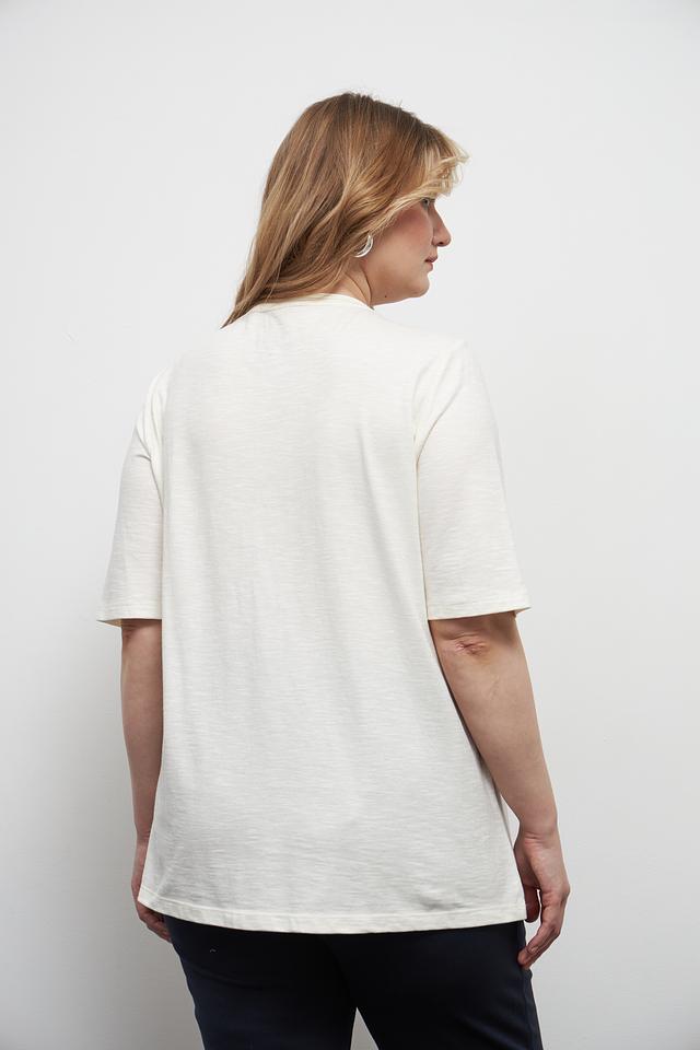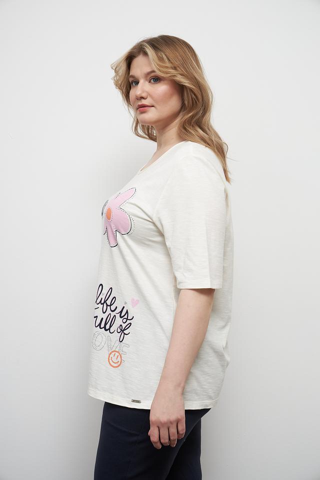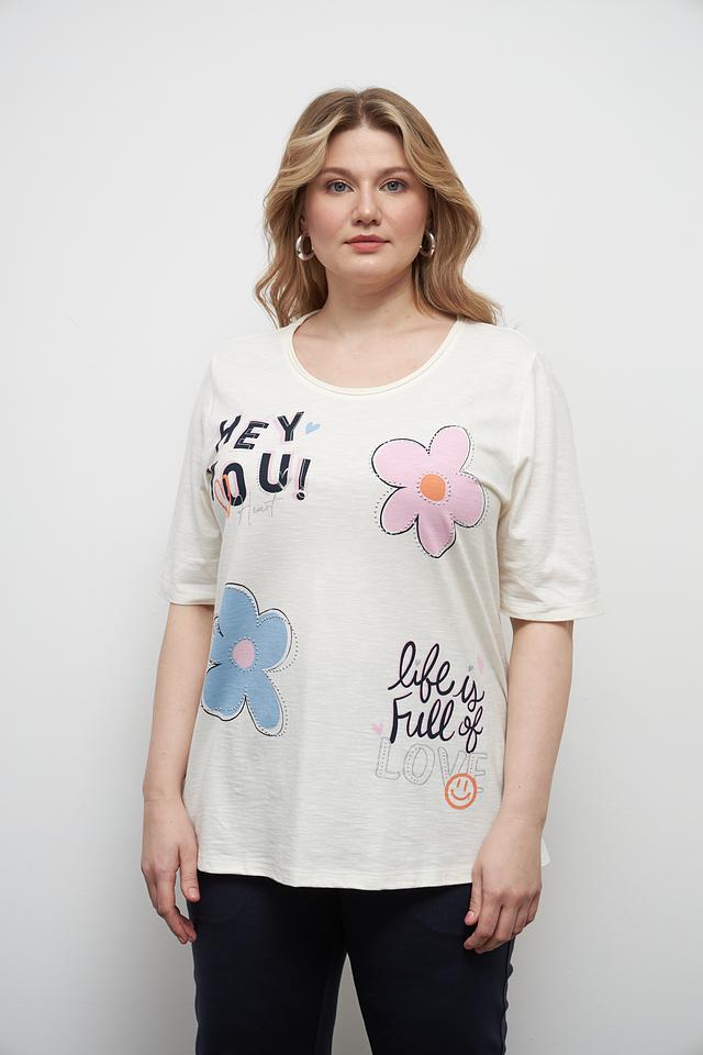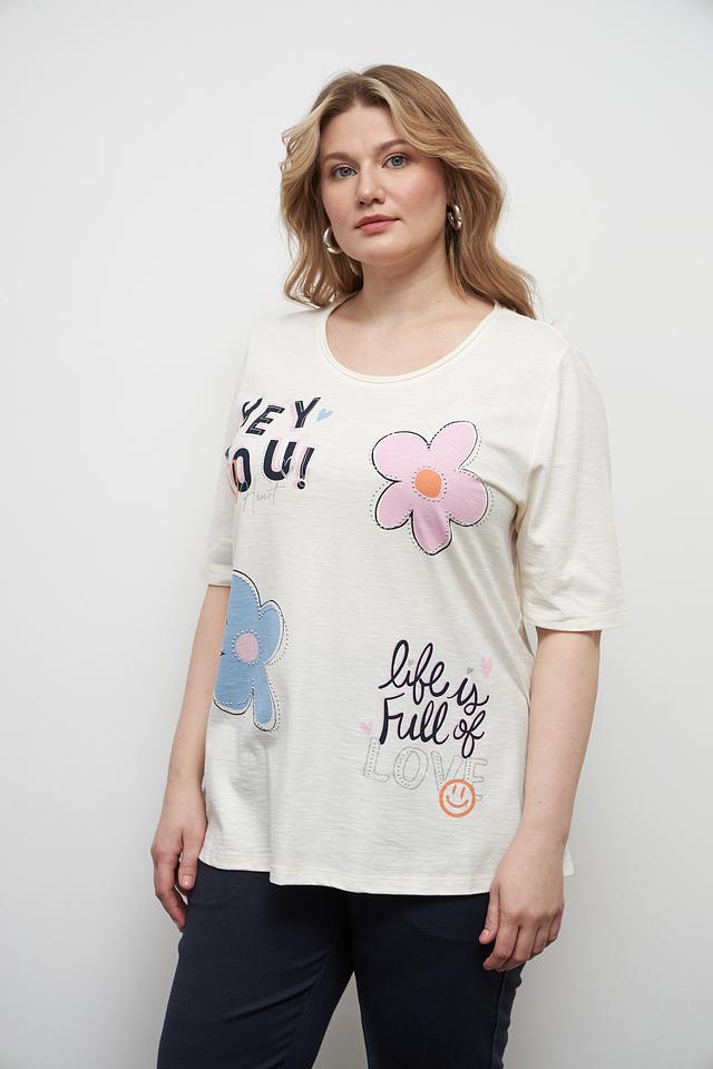 Женская футболка Via Appia кремового цвета с яркими цветочным принтом и позитивными надписями. Изготовлена из 100% хлопка, обеспечивающего комфорт и воздухопроницаемость. Состав: хлопок 100%
