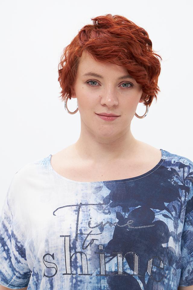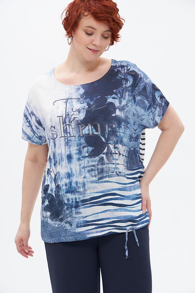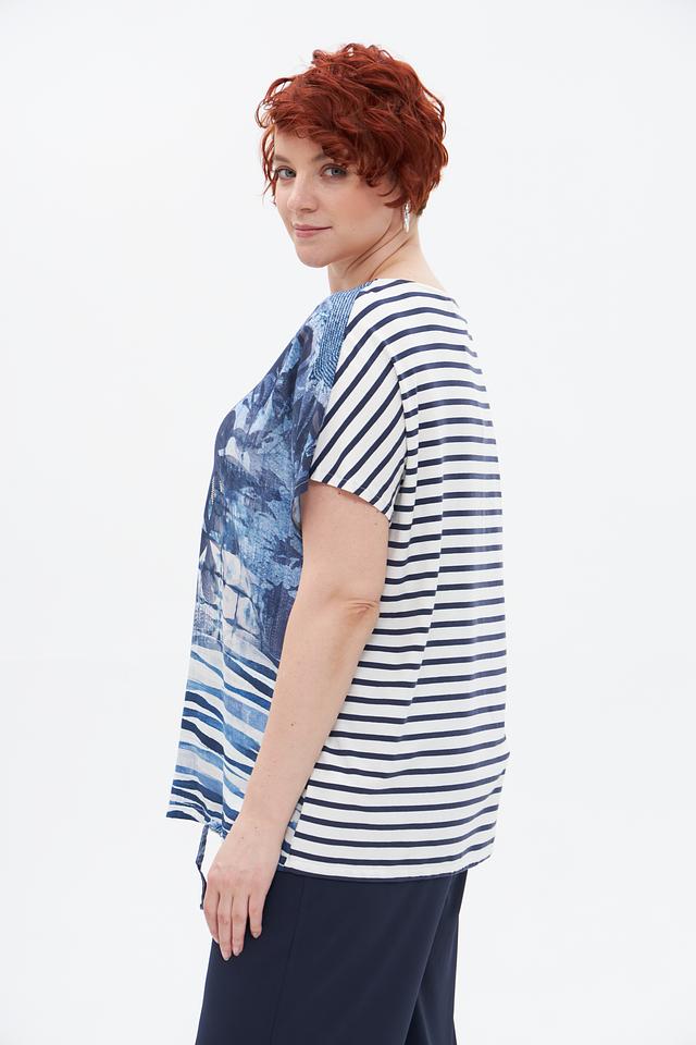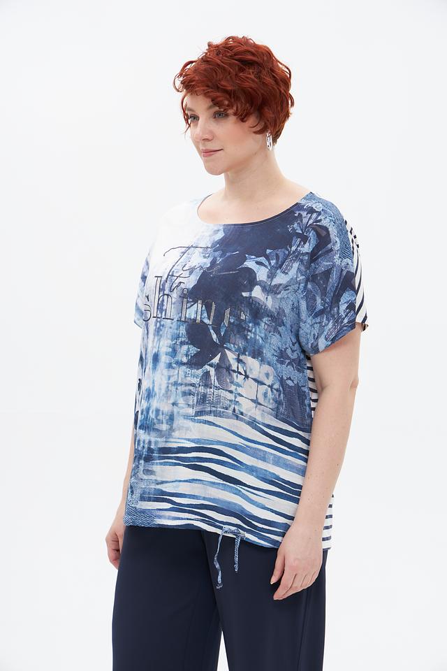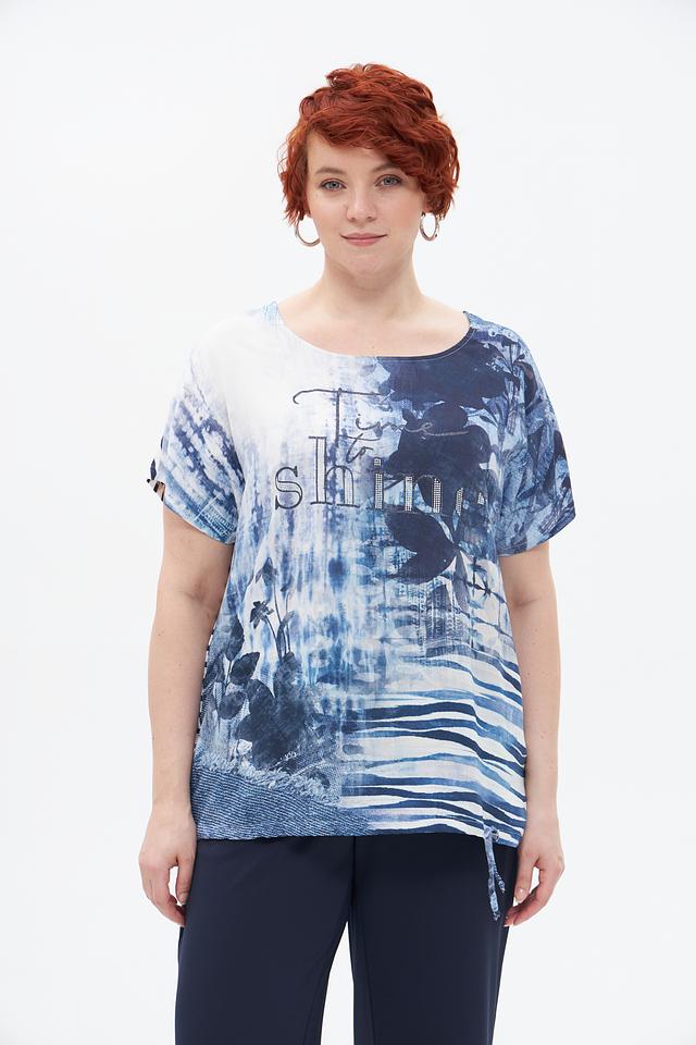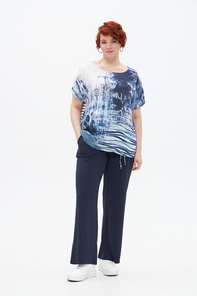 Женская футболка Via Appia синего цвета с оригинальным принтом и свободным кроем. Изготовлена из мягкого хлопка с добавлением модала и эластана для комфорта и отличной посадки. Состав: хлопок 47%, модал 47%, эластан 6%