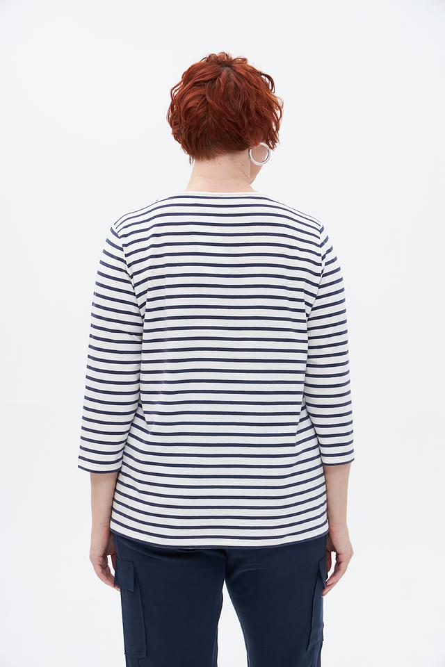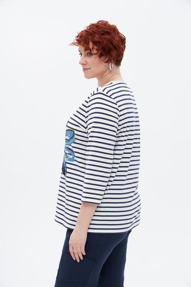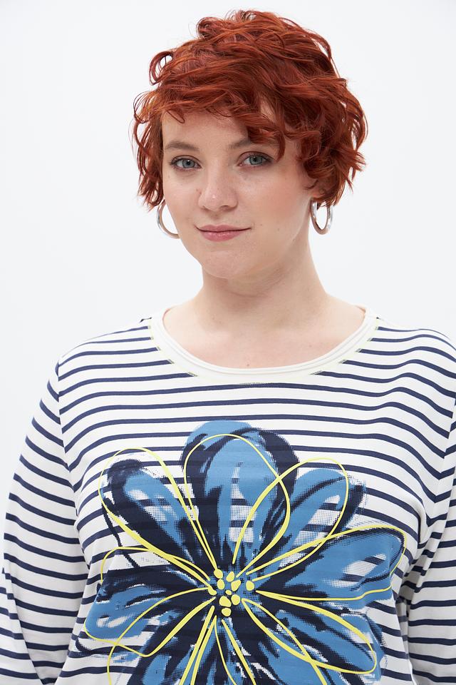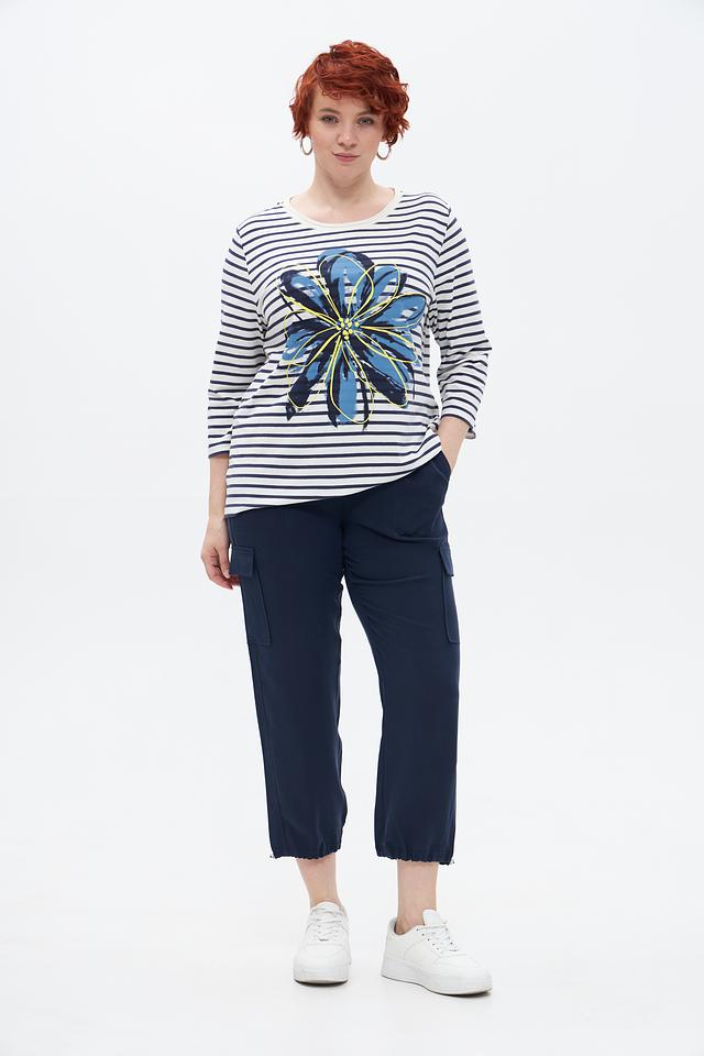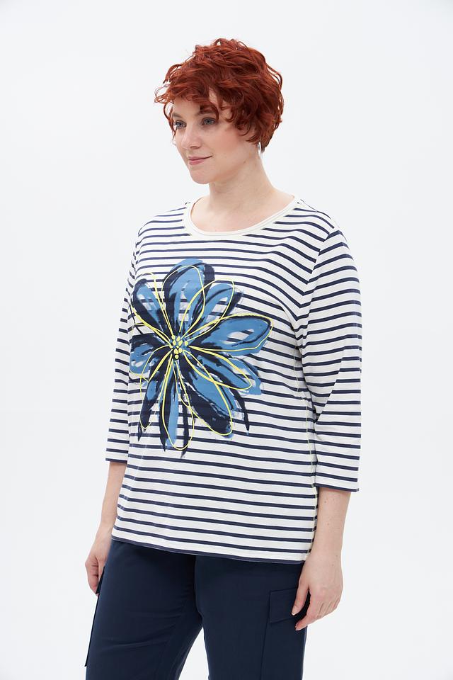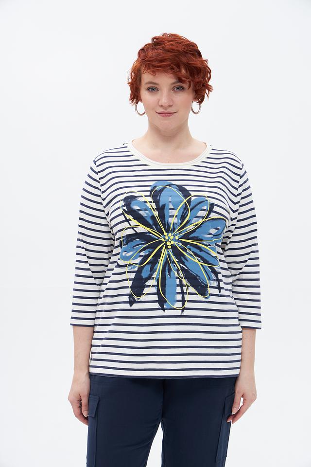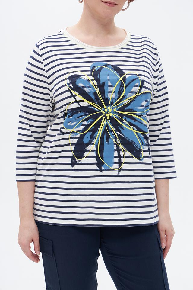 Основной цвет футболки – белый, украшенный синими полосами. Главная деталь дизайна – крупный цветочный принт в сине-голубых тонах с добавлением желтых акцентов. Принт расположен на груди и придает образу свежесть и оригинальность.