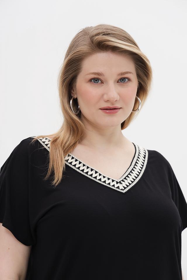 Футболка имеет классический чёрный цвет и прямой, слегка свободный крой, который подходит для разных типов фигур. Особый акцент в этой модели – декоративная отделка по вырезу горловины, придающая ей изысканность и оригинальность.
